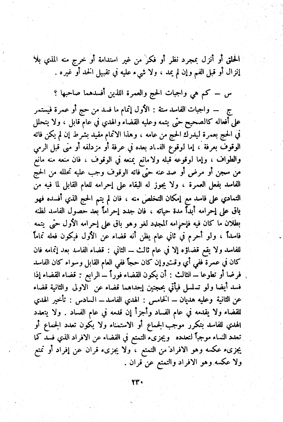ج _ وَاجِبَات الْفَاسِد سِتَّة الأول إتْمَام مَا فسد من حج أَو عمْرَة فيستمر على أَفعاله كَالصَّحِيحِ حَتَّى يتمه وَعَلِيهِ الْقَضَاء وَالْهَدْي فِي عَام قَابل وَلَا يتَحَلَّل فِي الْحَج بِعُمْرَة ليدرك الْحَج من عَامه وَهَذَا الْإِتْمَام مُقَيّد بِشَرْط إِن لم يكن فَاتَهُ الْوُقُوف بِعَرَفَة إِمَّا لوُقُوع الْفساد بعده فِي عَرَفَة أَو مُزْدَلِفَة أَو منى قبل الرَّمْي وَالطّواف وَإِمَّا لوُقُوعه قبله وَلَا مَانع يمنعهُ فِي الْوُقُوف فان مَنعه مِنْهُ مَانع من سجن أَو مرض أَو صد عَنهُ حَتَّى فَاتَهُ الْوُقُوف وَجب عَلَيْهِ تحلله من الْحَج الْفَاسِد بِفعل الْعمرَة وَلَا يجوز لَهُ الْبَقَاء على إِحْرَامه للعام الْقَابِل لما فِيهِ من التَّمَادِي على فَاسد مَعَ إِمْكَان التَّخَلُّص مِنْهُ فان لم يتم الْحَج الَّذِي أفْسدهُ فَهُوَ بَاقٍ على إِحْرَامه أبدا مُدَّة حَيَاته فان جدد إحراما بعد حُصُول الْفَاسِد لظَنّه بطلَان مَا كَانَ فِيهِ فإحرامه المجدد لَغْو وَهُوَ بَاقٍ على إِحْرَامه الأول حَتَّى يتمه فَاسِدا وَلَو أحرم فِي ثَانِي عَام يظنّ أَنه قَضَاء عَن الأول فَيكون فعله تَمامًا للفاسد وَلَا يَقع قَضَاؤُهُ إِلَّا فِي عَام ثَالِث الثَّانِي قَضَاء الْفَاسِد بعد إِتْمَامه فان كَانَ فِي عمْرَة فَفِي أَي وَقت وَإِن كَانَ حجا فَفِي الْعَام الْقَابِل وَسَوَاء كَانَ الْفَاسِد فرضا أَو تَطَوّعا الثَّالِث أَن يكون الْقَضَاء فَوْرًا الرَّابِع قَضَاء الْقَضَاء إِذا فسد أَيْضا وَلَو تسلسل فَيَأْتِي بحجتين إجداهما قَضَاء عَن الأولى وَالثَّانيَِة قَضَاء عَن الثَّانِيَة وَعَلِيهِ هديان الْخَامِس الْهَدْي الْفَاسِد السَّادِس تَأْخِير الْهَدْي للْقَضَاء وَلَا يقدمهُ فِي عَام الْفساد وأجزأ إِن قدمه فِي عَام الْفساد