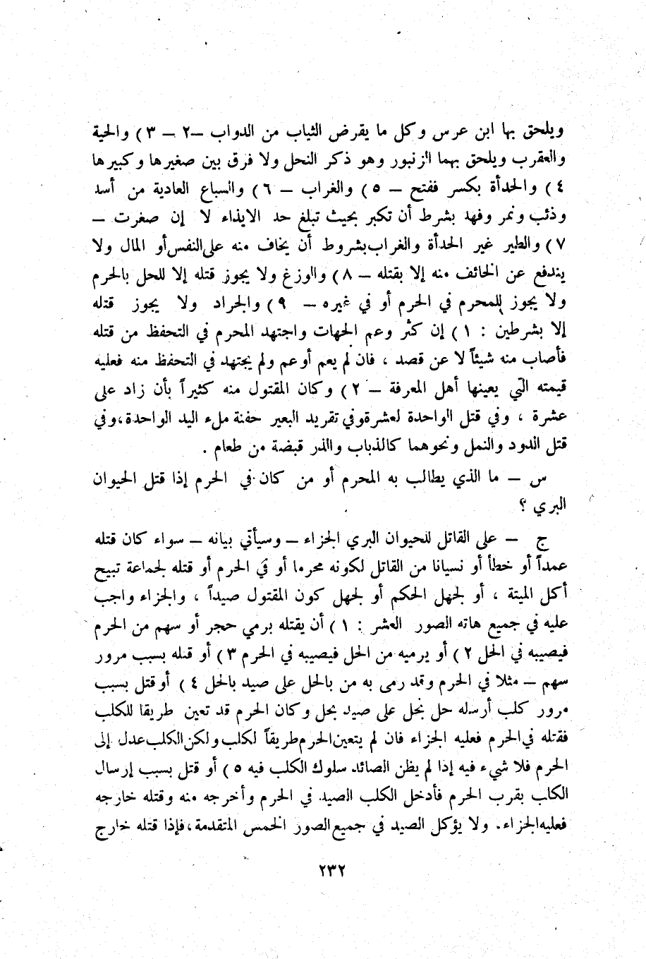 ج _ على الْقَاتِل للحيوان الْبري الْجَزَاء وَسَيَأْتِي بَيَانه سَوَاء كَانَ قَتله عمدا أَو خطأ أَو نِسْيَانا من الْقَاتِل لكَونه محرما أَو فِي الْحرم أَو قَتله لجَماعَة تبيح أكل الْميتَة أَو لجهل الحكم أَو لجهل كَون الْمَقْتُول صيدا وَالْجَزَاء وَاجِب عَلَيْهِ فِي جَمِيع هاته الصُّور الْعشْر 1) أَن يقْتله برمي حجر أَو سهم من الْحرم فَيُصِيبهُ فِي الْحل 2) أَو يرميه من الْحل فَيُصِيبهُ فِي الْحرم 3) أَو قَتله بِسَبَب مُرُور سهم مثلا فِي الْحرم وَقد رمى بِهِ من بِالْحلِّ على صيد بِالْحلِّ 4) أَو قتل بِسَبَب مُرُور كلب أرْسلهُ حل نجل على صيد بِحل وَكَانَ الْحرم قد تعين طَرِيقا للكلب فَقتله فِي الْحرم فَعَلَيهِ الْجَزَاء فَإِن لم يتَعَيَّن الْحرم طَرِيقا لكَلْب وَلَكِن الْكَلْب عدل إِلَى الْحرم فَلَا شَيْء فِيهِ إِذا لم يظنّ الصَّائِد سلوك الْكَلْب فِيهِ 5) أَو قتل بِسَبَب إرْسَال الْكَلْب بِقرب الْحرم فَأدْخل الْكَلْب الصَّيْد فِي الْحرم وَأخرجه مِنْهُ وَقَتله خَارجه فَعَلَيهِ الْجَزَاء