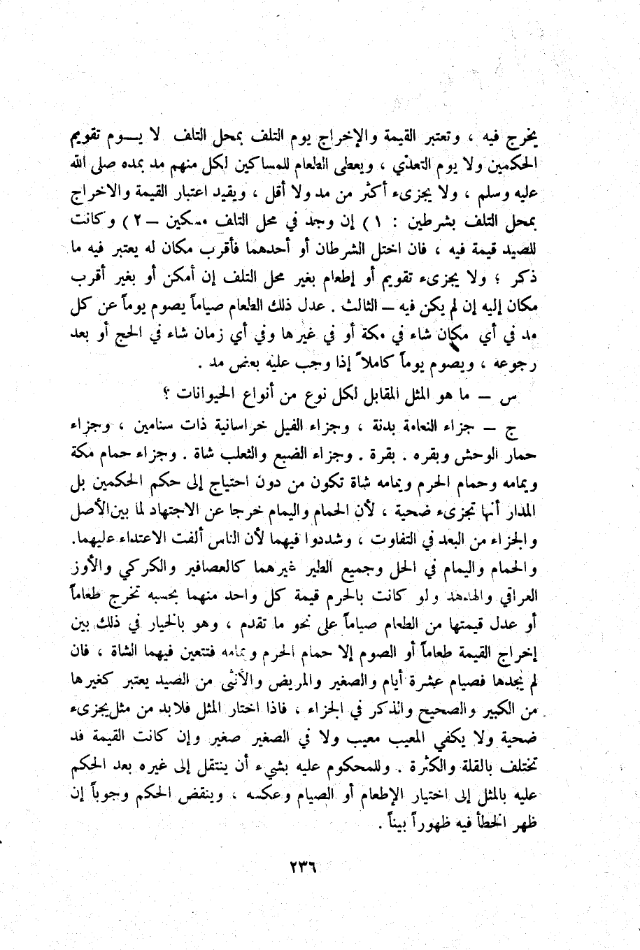 ج _ جَزَاء النعامة بَدَنَة وَجَزَاء الْفِيل خراسانية ذَات سنَامَيْنِ وَجَزَاء حمَار الْوَحْش وبقره بقرة وَجَزَاء الضبع والثعلب شَاة