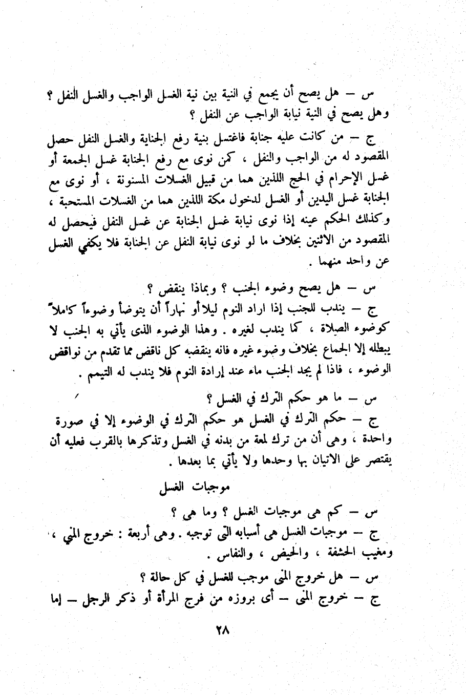 ج _ من كَانَت عَلَيْهِ جَنَابَة فاغتسل بنية رفع الْجَنَابَة وَالْغسْل النَّفْل حصل الْمَقْصُود لَهُ من الْوَاجِب وَالنَّفْل كمن نوى مَعَ رفع الْجِنَايَة غسل الْجُمُعَة أَو غسل الْإِحْرَام فِي الْحَج اللَّذين هما من قبيل الغسلات المسنونة أَو نوى مَعَ الْجَنَابَة غسل الْيَدَيْنِ أَو الْغسْل لدُخُول مَكَّة اللَّذين هما من الغسلات المستحبة وَكَذَلِكَ الحكم عينه إِذا نوى نِيَابَة غسل الْجَنَابَة من غسل النَّفْل فَيحصل لَهُ الْمَقْصُود من الْإِثْنَيْنِ بِخِلَاف مَا لَو نوى نِيَابَة النَّفْل عَن الْجَنَابَة فَلَا يَكْفِي الْغسْل عَن وَاحِد مِنْهُمَا
