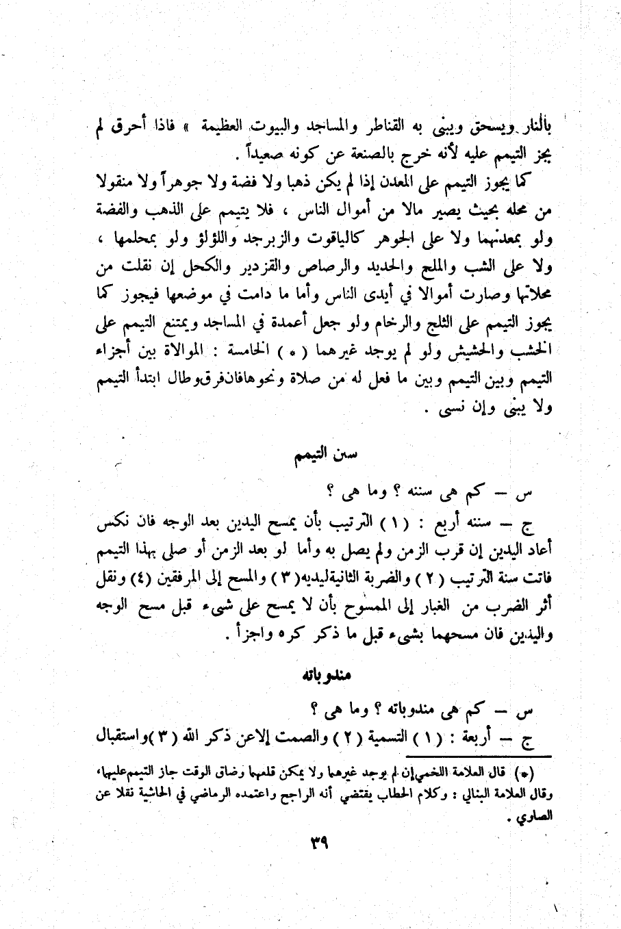 ج _ سنَنه أَربع (1) التَّرْتِيب بِأَن يمسح الْيَدَيْنِ بعد الْوَجْه فَإِن نكس أعَاد الْيَدَيْنِ إِن قرب الزَّمن وَلم يصل بِهِ وَأما لَو بعد الزَّمن أَو صلى بِهَذَا التَّيَمُّم فَاتَت سنة التَّرْتِيب (2) والضربة الثَّانِيَة ليديه (3) وَالْمسح إِلَى الْمرْفقين (4) وَنقل أثر الضَّرْب من الْغُبَار إِلَى الْمَمْسُوح بِأَن لَا يمسح على شَيْء قبل مسح الْوَجْه وَالْيَدَيْنِ فَإِن مسحهما بِشَيْء قبل مَا ذكر كره واجزأ