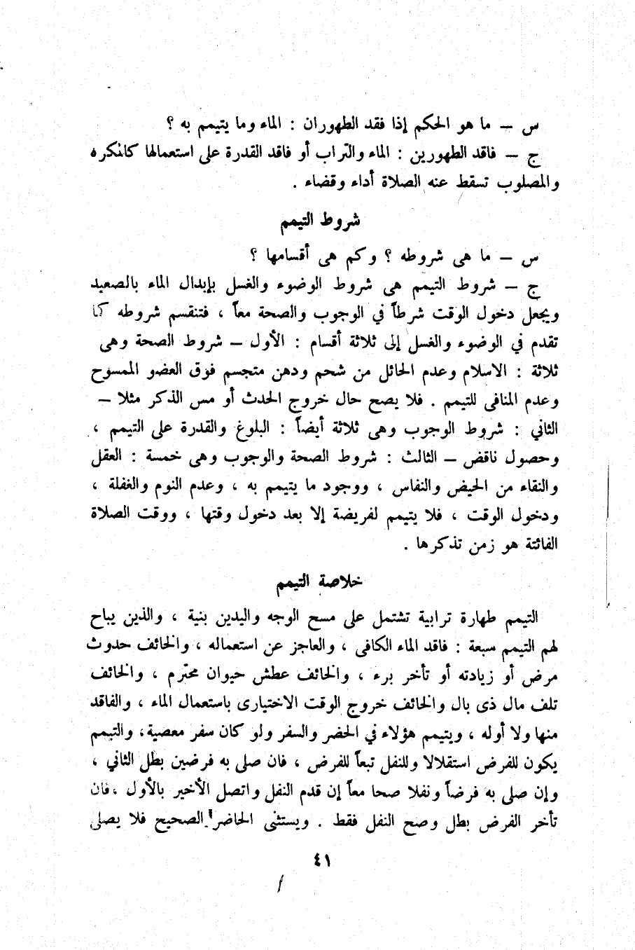 التَّيَمُّم طَهَارَة ترابية تشْتَمل على مسح الْوَجْه وَالْيَدَيْنِ بنية وَالَّذين يُبَاح لَهُم التَّيَمُّم سَبْعَة فَاقِد المَاء الْكَافِي وَالْعَاجِز عَن اسْتِعْمَاله والخائف حُدُوث مرض أَو زِيَادَته أَو تَأَخّر برْء والخائف عَطش حَيَوَان مُحْتَرم والخائف تلف مَال ذِي بَال والخائف خُرُوج الْوَقْت الإختياري بِاسْتِعْمَال المَاء والفاقد مِنْهَا وَلَا أَوله وَيتَيَمَّم هَؤُلَاءِ فِي الْحَضَر وَالسّفر وَلَو كَانَ سفر مَعْصِيّة وَالتَّيَمُّم يكون للْفَرض اسْتِقْلَالا وللنفل تبعا للْفَرض فَإِن صلى بِهِ فرضين بَطل الثَّانِي وَإِن صلى بِهِ فرضا ونفلا صَحا مَعًا إِن قدم النَّفْل واتصل الْأَخير بِالْأولِ فَإِن تَأَخّر الْفَرْض بَطل وَصَحَّ النَّفْل فَقَط