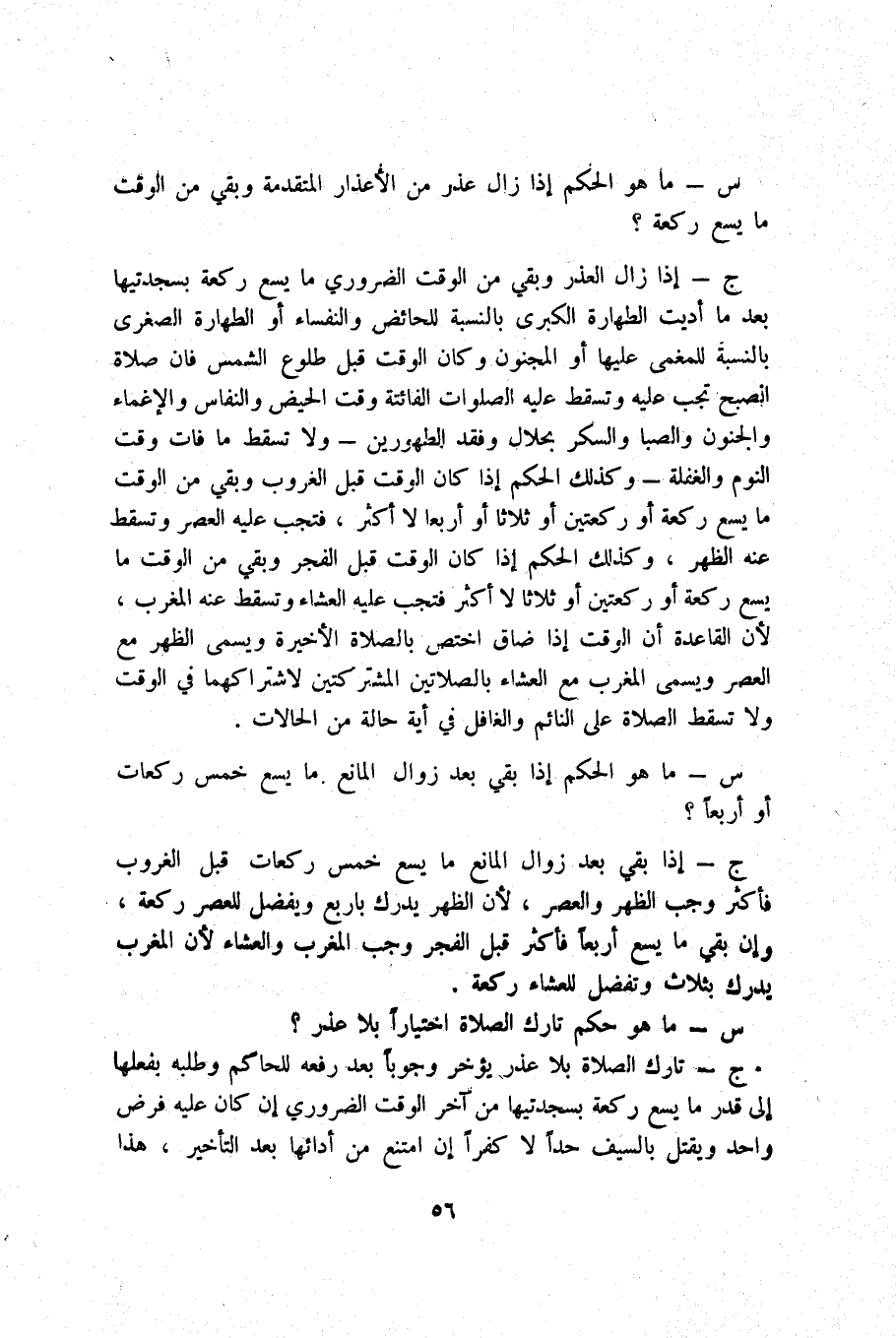 ج _ إِذا زَالَ الْعذر وَبَقِي من الْوَقْت الضَّرُورِيّ مَا يسع رَكْعَة بسجدتيها بعد مَا أدّيت الطَّهَارَة الْكُبْرَى بِالنِّسْبَةِ للحائض وَالنُّفَسَاء أَو الطَّهَارَة الصُّغْرَى بِالنِّسْبَةِ للمغمى عَلَيْهَا أَو الْمَجْنُون وَكَانَ الْوَقْت قبل طُلُوع الشَّمْس فَإِن صَلَاة الصُّبْح تجب عَلَيْهِ وَتسقط عَلَيْهِ الصَّلَوَات الْفَائِتَة وَقت الْحيض وَالنّفاس وَالْإِغْمَاء وَالْجُنُون وَالصبَا وَالسكر بحلال وفقد الطهُورَيْنِ وَلَا تسْقط مَا فَاتَ وَقت النّوم والغفلة وَكَذَلِكَ الحكم إِذا كَانَ الْوَقْت قبل الْغُرُوب وَبَقِي من الْوَقْت مَا يسع رَكْعَة أَو رَكْعَتَيْنِ أَو ثَلَاثًا أَو أَرْبعا لَا أَكثر فَتجب عَلَيْهِ الْعَصْر وَتسقط عَنهُ الظّهْر وَكَذَلِكَ الحكم إِذا كَانَ الْوَقْت قبل الْفجْر وَبَقِي من الْوَقْت مَا يسع رَكْعَة أَو رَكْعَتَيْنِ أَو ثَلَاثًا لَا أَكثر فَتجب عَلَيْهِ الْعشَاء وَتسقط عَنهُ الْمغرب لِأَن الْقَاعِدَة أَن الْوَقْت إِذا ضَاقَ اخْتصَّ بِالصَّلَاةِ الْأَخِيرَة وَيُسمى الظّهْر مَعَ الْعَصْر وَيُسمى الْمغرب مَعَ الْعشَاء بالصلاتين المشتركتين لاشْتِرَاكهمَا فِي الْوَقْت وَلَا تسْقط الصَّلَاة على النَّائِم والغافل فِي أَيَّة حَالَة من الْحَالَات