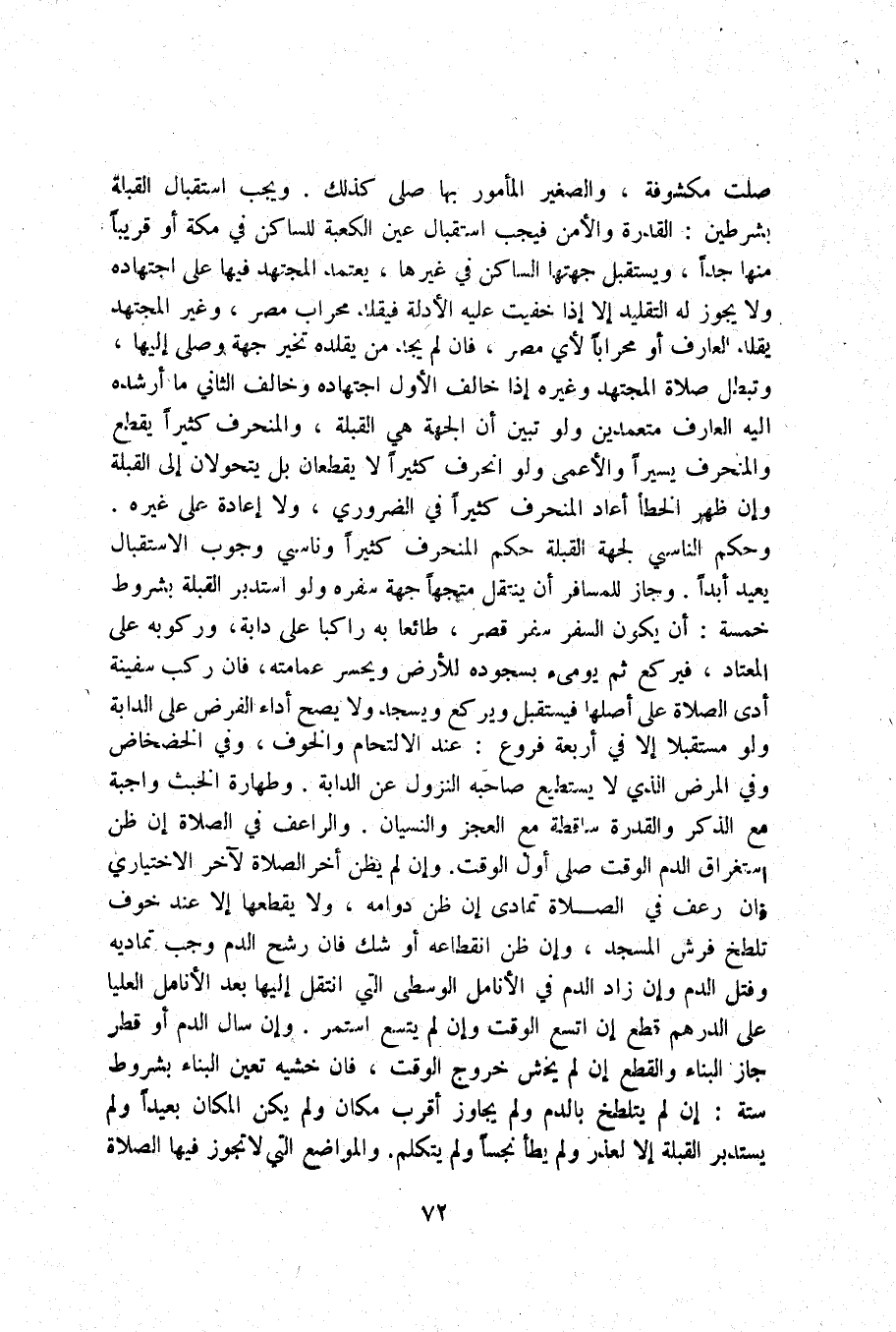 وَجَاز للْمُسَافِر أَن ينْتَقل متجها جِهَة سَفَره وَلَو استدبر الْقبْلَة بِشُرُوط خَمْسَة أَن يكون السّفر سفر قصر طَائِعا بِهِ رَاكِبًا على دَابَّة وركوبه على الْمُعْتَاد فيركع ثمَّ يومىء بسجوده للْأَرْض ويحسر عمَامَته فَإِن ركب سفينة أدّى الصَّلَاة على أَصْلهَا فيستقبل ويركع وَيسْجد وَلَا يَصح أَدَاء الْفَرْض على الدَّابَّة وَلَو مُسْتَقْبلا إِلَّا فِي أَرْبَعَة فروع عِنْد الإلتحام وَالْخَوْف وَفِي الخضخاض وَفِي الْمَرَض الَّذِي لَا يَسْتَطِيع صَاحبه النُّزُول عَن الدَّابَّة