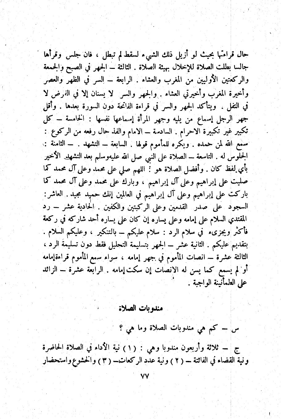 ج _ ثَلَاثَة وَأَرْبَعُونَ مَنْدُوبًا وَهِي (1) نِيَّة الْأَدَاء فِي الصَّلَاة الْحَاضِرَة وَنِيَّة الْقَضَاء فِي الْفَائِتَة (2) وَنِيَّة عدد الرَّكْعَات (3) والخشوع واستحضار