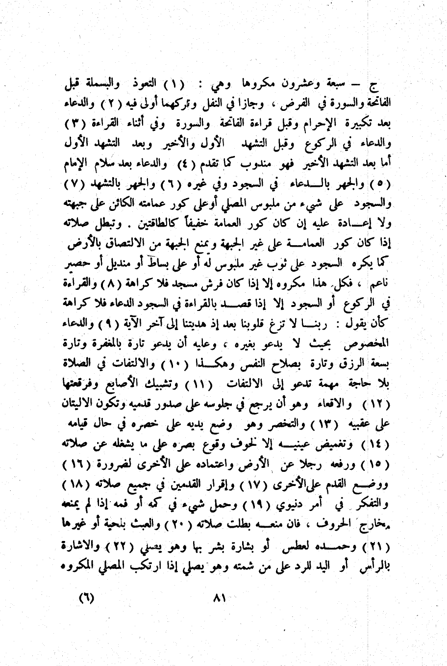 وَتبطل صلَاته إِذا كَانَ كور الْعِمَامَة على غير الْجَبْهَة وَيمْنَع الْجَبْهَة من الإلتصاق بِالْأَرْضِ كَمَا يكره السُّجُود على ثوب غير ملبوس لَهُ أَو على بِسَاط أَو منديل أَو حَصِير ناعم فَكل هَذَا مَكْرُوه إِلَّا إِذا كَانَ فرش مَسْجِد فَلَا كَرَاهَة (8) وَالْقِرَاءَة فِي الرُّكُوع أَو السُّجُود إِلَّا إِذا قصد بِالْقِرَاءَةِ فِي السُّجُود الدُّعَاء فَلَا كَرَاهَة كَأَن يَقُول رَبنَا لَا تزغ قُلُوبنَا بعد إِذْ هديتنا إِلَى آخر الْآيَة (9) وَالدُّعَاء الْمَخْصُوص بِحَيْثُ لَا يَدْعُو بِغَيْرِهِ وَعَلِيهِ أَن يَدْعُو تَارَة بالمغفرة وَتارَة بسعة الرزق وَتارَة بصلاح النَّفس وَهَكَذَا (10) والإلتفات فِي الصَّلَاة بِلَا حَاجَة مهمة تَدْعُو إِلَى الإلتفات (11) وتشبيك الْأَصَابِع وفرقعتها (12) والإقعاء وَهُوَ أَن يرجع فِي جُلُوسه على صُدُور قَدَمَيْهِ وَتَكون الإليتان على عَقِبَيْهِ (13) والتخصر وَهُوَ وضع يَدَيْهِ على خصره فِي حَال قِيَامه (14) وتغميض عَيْنَيْهِ إِلَّا لخوف وُقُوع بَصَره على مَا يشْغلهُ عَن صلَاته (15) وَرَفعه رجلا عَن الأَرْض واعتماده على الْأُخْرَى لضَرُورَة (16) وَوضع الْقدَم على الْأُخْرَى (17) وَإِقْرَار الْقَدَمَيْنِ فِي جَمِيع صلَاته (18) والتفكر فِي أَمر دُنْيَوِيّ (19) وَحمل شَيْء فِي كمه أَو فَمه إِذا لم يمنعهُ مخارج الْحُرُوف فَإِن مَنعه بطلت صلَاته 20 والعبث بلحية أَو غَيرهَا (21) وحمده لعطس أَو بِشَارَة بشر بهَا وَهُوَ يُصَلِّي (22) وَالْإِشَارَة بِالرَّأْسِ أَو الْيَد للرَّدّ على من شمته وَهُوَ يُصَلِّي إِذا ارْتكب الْمُصَلِّي الْمَكْرُوه