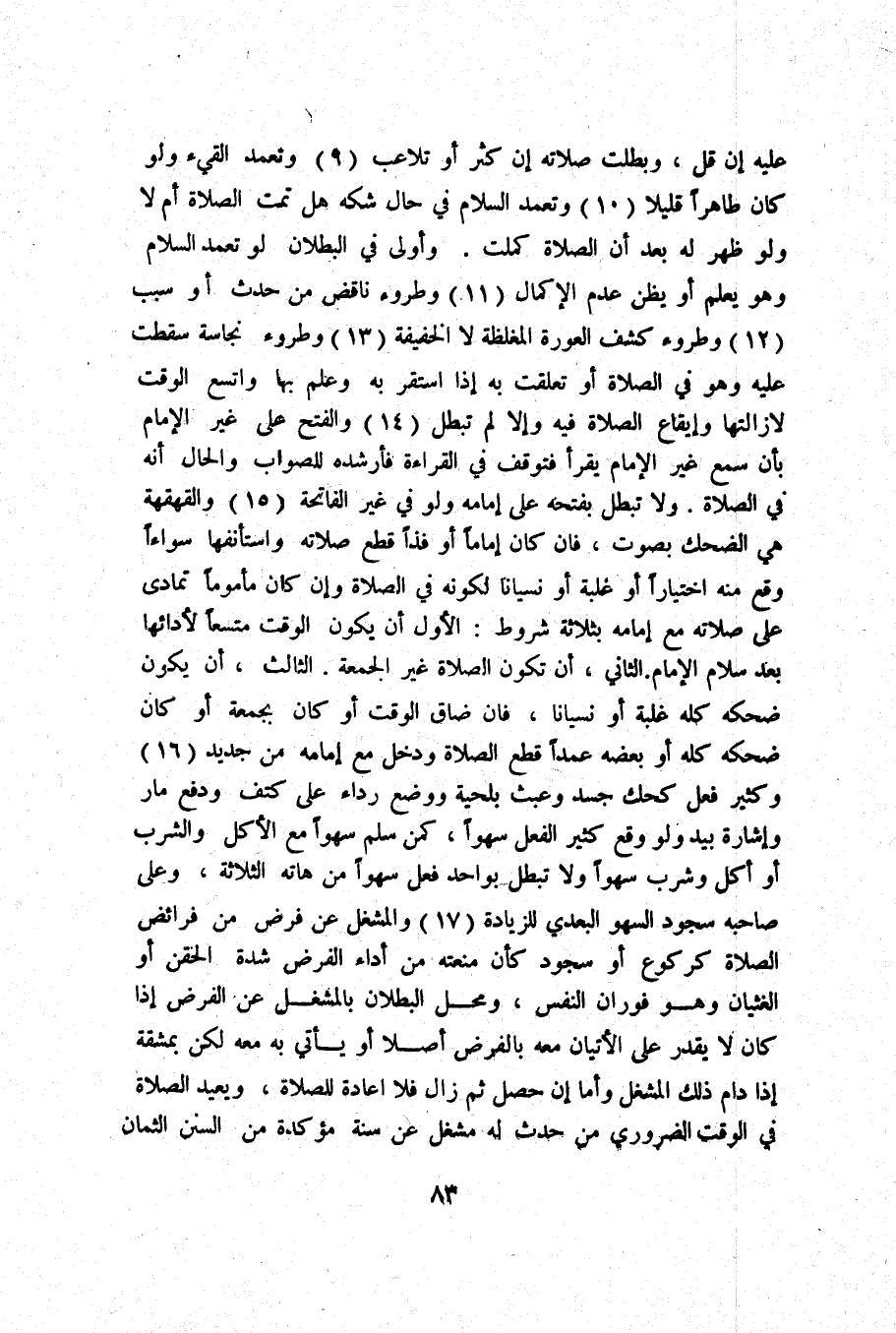 الثَّالِث أَن يكون ضحكه كُله غَلَبَة أَو نِسْيَانا فان ضَاقَ الْوَقْت أَو كَانَ بجمعة اَوْ كَانَ ضحكة كلة أَو بعضه عمدا قطع الصَّلَاة وَدخل مَعَ إِمَامه من جَدِيد (16) وَكثير فعل كحك جَسَد وعبث بلحية وَوضع رِدَاء على كتف وَدفع مار وَإِشَارَة بيد وَلَو وَقع كثير الْفِعْل سَهوا كمن سلم سَهوا مَعَ الْأكل وَالشرب أَو أكل وَشرب سَهوا وَلَا تبطل بِوَاحِد فعل سَهوا من هاته الثَّلَاثَة وعَلى صَاحبه سُجُود السَّهْو البعدي للزِّيَادَة (17) والمشغل عَن فرض من فَرَائض الصَّلَاة كركوع أَو سُجُود كَأَن منعته من أَدَاء الْفَرْض شدَّة الحقن أَو الغثيان وَهُوَ فوران النَّفس وَمحل الْبطلَان بالمشغل عَن الْفَرْض إِذا كَانَ لَا يقدر على الْإِتْيَان مَعَه بِالْفَرْضِ أصلا أَو يَأْتِي بِهِ مَعَه لَكِن بِمَشَقَّة إِذا دَامَ ذَلِك المشغل وَأما إِن حصل ثمَّ زَالَ فَلَا إِعَادَة للصَّلَاة وَيُعِيد الصَّلَاة فِي الْوَقْت الضَّرُورِيّ من حدث لَهُ مشغل عَن سنة مُؤَكدَة من السّنَن الثمان