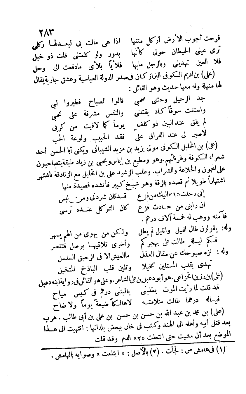 علي بن الخليل الكوفي مولى يزيد بن مزيد الشيباني ويكنى أبا الحسن أحد شعراء الكوفة وظرفائهم. وهو ومطيع بن إياس ويحيى بن زياد طبقة يتصاحبون على المجون والخلاعة والشراب. وطلب الرشيد علي بن الخليل مع الزنادقة فاشتهر اشتهاراً طويلاً ثم قصده بالرقة وهو شيخ كبير فأنشده قصيدة منها: