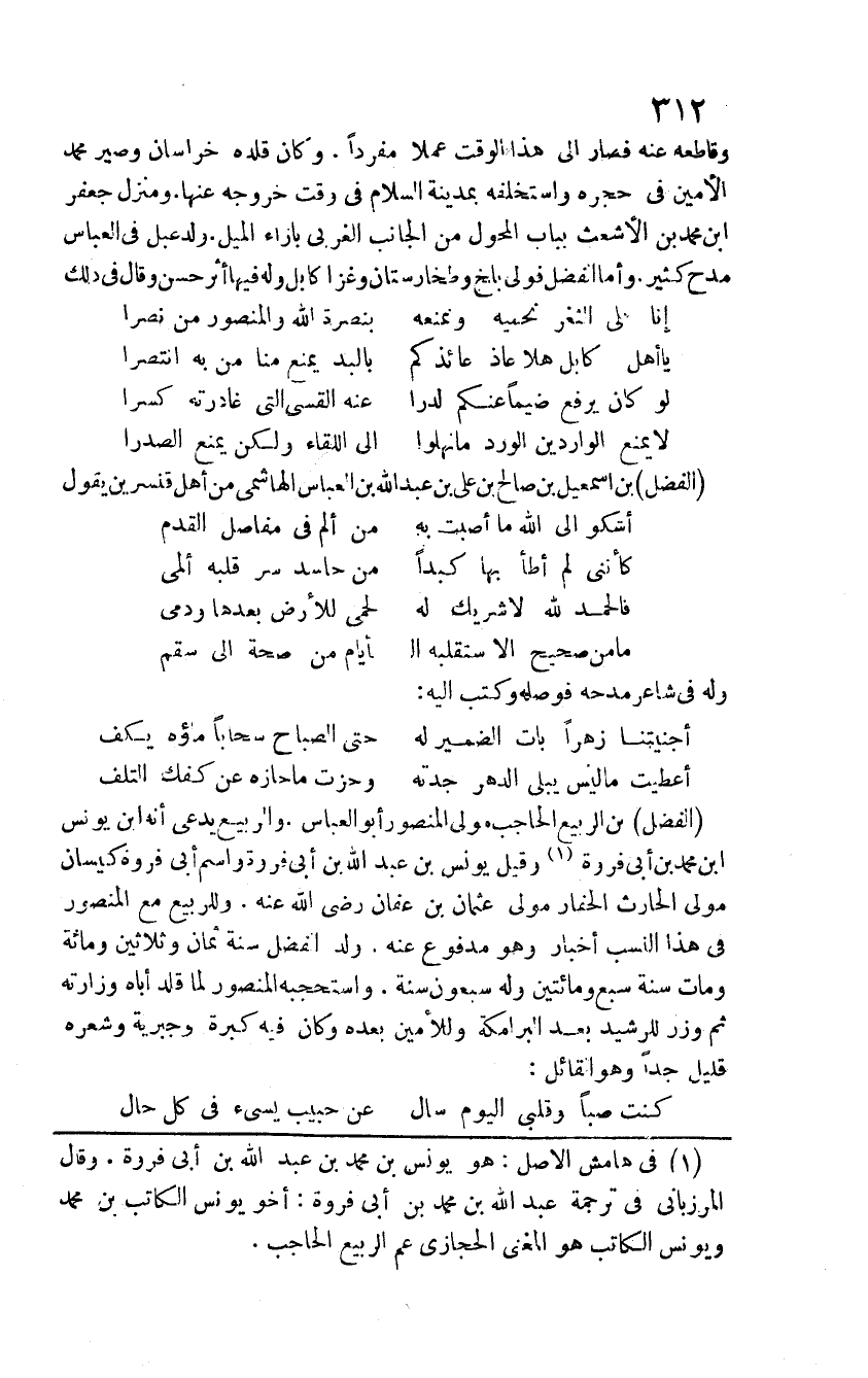 الفضل بن الربيع الحاجب مولى المنصور أبو العباس. والربيع يدعي أنه ابن يونس بن محمد بن أبي فروة وقيل يونس بن عبد الله بن أبي فروة وسام أبي فروة كيسان مولى الحارث الحفار مولى عثمان بن عفان رضي الله عنه. وللربيع مع المنصور في هذا النسب أخبار وهو مدفوع عنه. ولد الفضل سنة ثمان وثلاثين ومائة ومات سنة سبع ومائتين وله سبعون سنة. واستحجبه المنصور لما قلد أباه وزارته ثم وزر للرشيد بعد الرامكة وللأمين بعده وكان فيه كبرة جبرة وشعره قليل جداً وهو القائل: