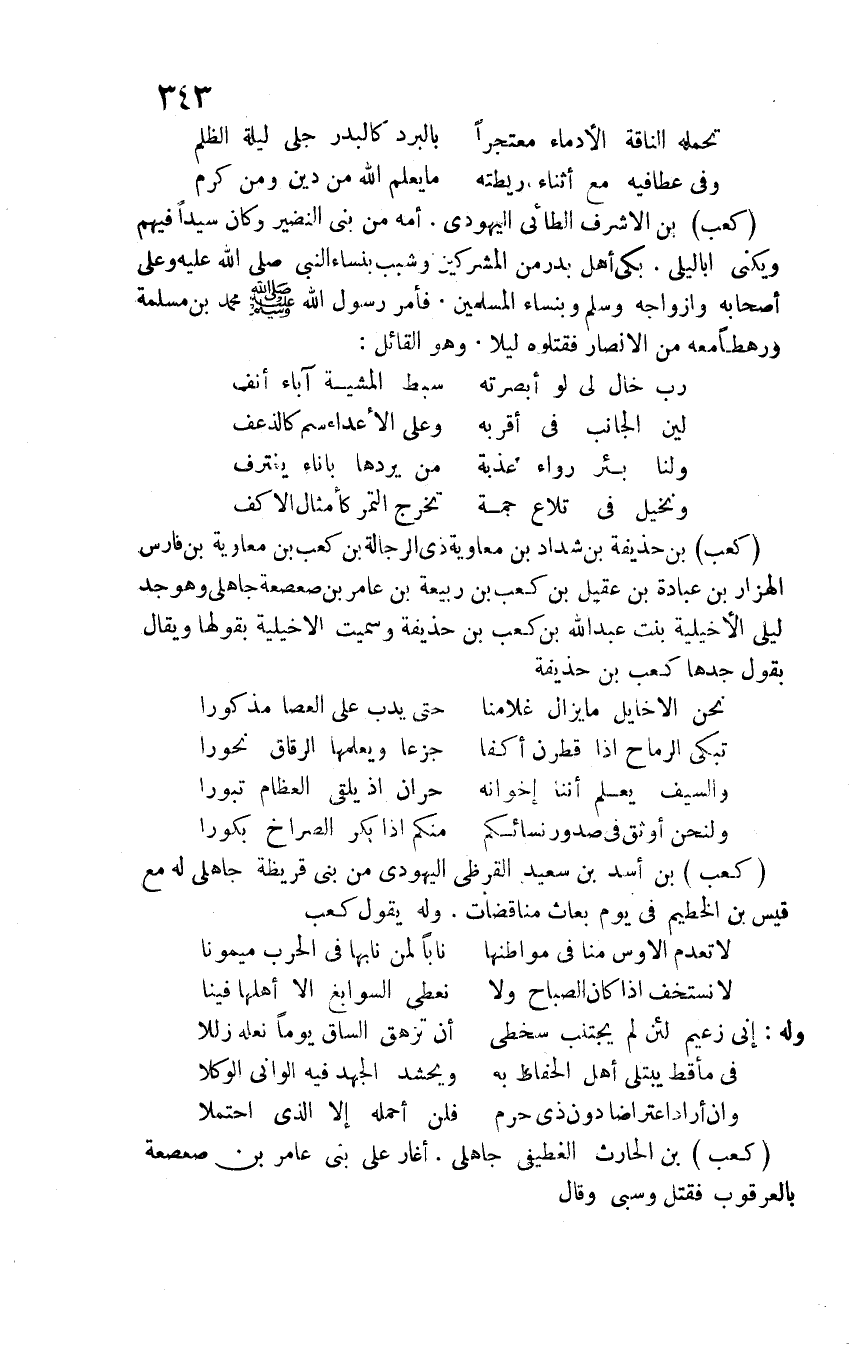 كعب بن اِلأشرف الطائي اليهودي. أمه من بني النضير وكان سيداً فيهم ويكنى أبا ليلى. بكى أهل بدر من المشركين وشبب بنساء النبي صلى الله عليه وأصحابه وأزواجه وسلم وبنساء المسلمين. فأمر رسول الله صلى الله عليه وسلم محمد بن مسلمة ورهطاً معه من الأنصار فقتلوه ليلاً. وهو القائل: