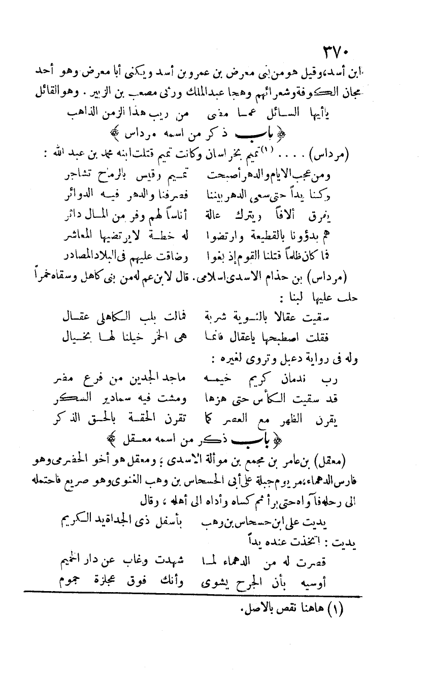 مرداس بن حذام الأسدي إسلامي. قال لابن عم له من بني كاهل وسقاه خمراً حلب عليها لبناً: