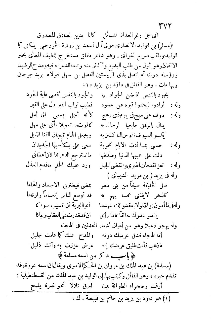 مسلم بن الوليد الأنصاري مولى آل أسعد بن زرارة الخزرجي يكنى أبا الوليد ويلقب صريع الغواني. وهو شاعر مفلق مستخرج للطيف المعاني بحلو الألفاظ وهو أول من طلب البديع وأكثر منه وتبعه الشعراء فيه ومدح الرشيد ورؤساء دولته ثم اتصل بذي الرياستين الفضل بن سهل فولاه بريد جرجان وبها مات. وهو القائل في داؤد بن زيد:
