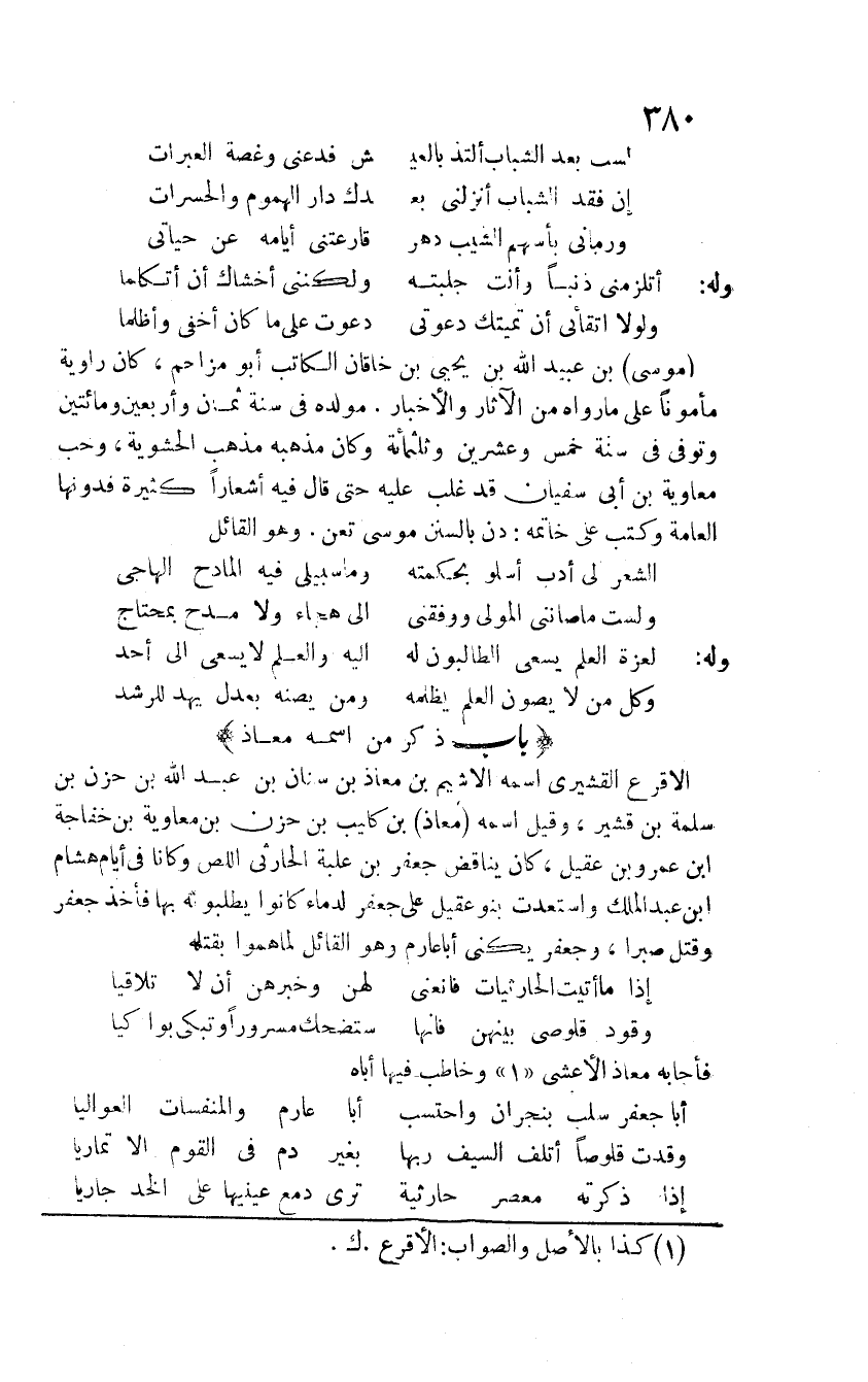 موسى بن عبيد الله بن يحيى بن خاقان الكاتب أبو مزاحم، كان راوية مأموناً على ما رواه من الآثار والأخبار، مولده في سنة ثمان وأربعين ومائتين وتوفي في سنة خمس وعشرين وثلثمائة وكان مذهبه مذهب الحشوية، وحب معاوية بن أبي سفيان قد غلب عليه حتى قال فيه أشعاراً كثيرة فدونها العامة وكتب على خاتمه: دن بالسنن موسى تعن. وهو القائل: