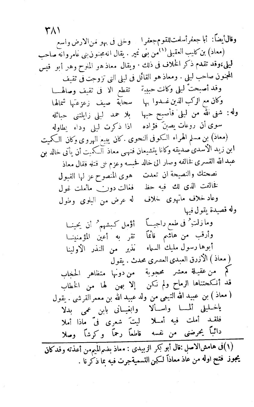 معاذ بن كليب العقيلي من بني نمير. يقال إنه مجنون بني عامر وإنه صاحب ليلى، وقد تقدم ذكر الخلاف في ذلك. ويقال معاذ هو الملوح وهو أبو قيس المجنون صاحب ليلى. ومعاذ هو القائل في ليلى التي تزوجت في ثقيف: