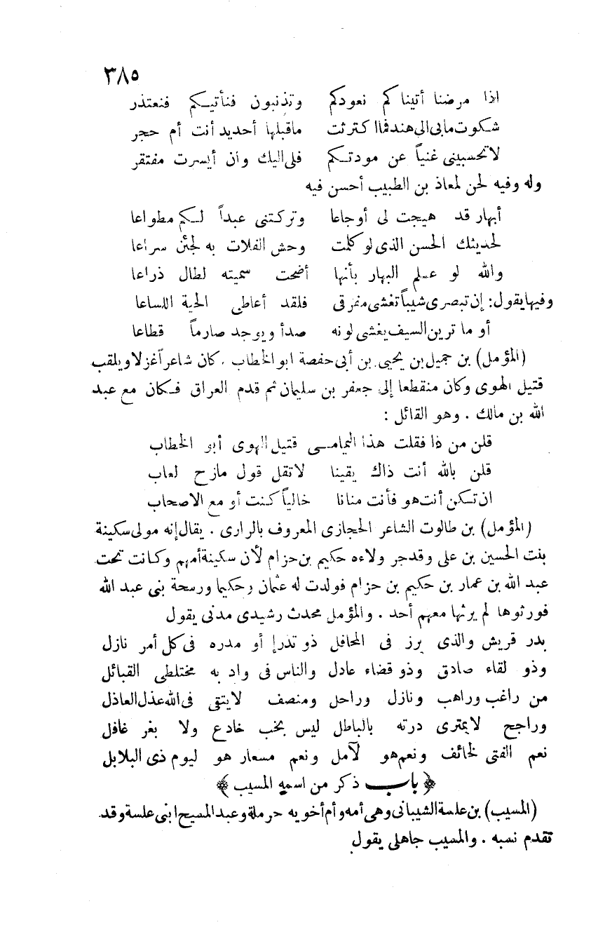 المؤمل بن جميل بن يحيى بن أبي حفصة أبو الخطاب. كان شاعراً غزلاً ويلقب قتيل الهوى وكان منقطعاً إلى جعفر بن سليمان ثم قدم العراق فكان مع عبد الله بن مالك. وهو القائل: