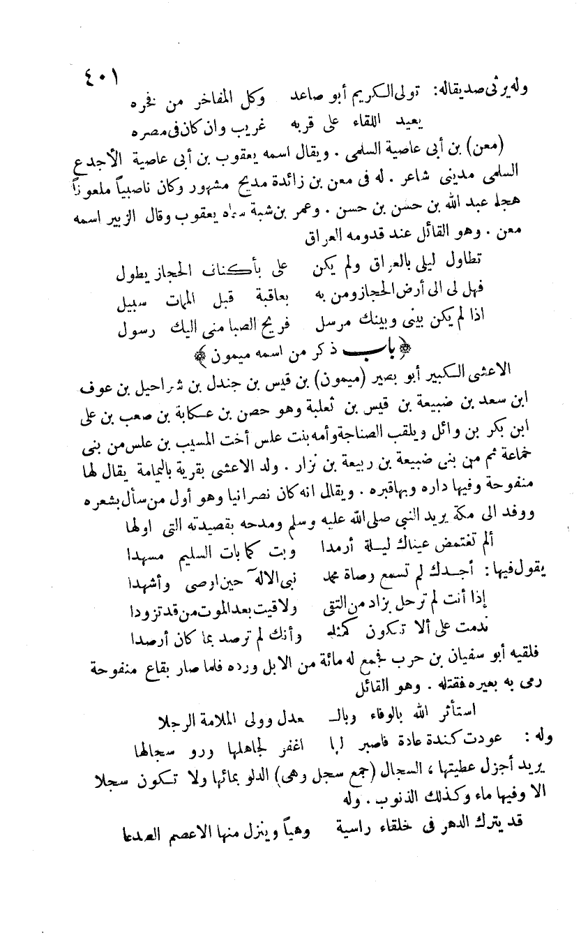 الأعشى الكبير أبو بصير ميمون بن قيس بن جندل بن شراحيل بن عوف بن سعد بن ضبيعة بن قيس بن ثعلبة وهو حصن بن عكابة بن صعب ابن علي بن بكر بن وائل ويلقب الصناجة وأمه بنت علس أخت المسيب بن علي من بني خماعة ثم من بني ضبيعة بن ربيعة بن نزار ولد الأعشى بقرية باليمامة يقال لها منفوحة وفيها داره وبها قبره. ويقال إنه كان نصرانياً وهو أول من سأل بشعره ووفد إلى مكة يريد النبي صلى الله عليه وسلم ومدحه بقصيدته التي ألولها: