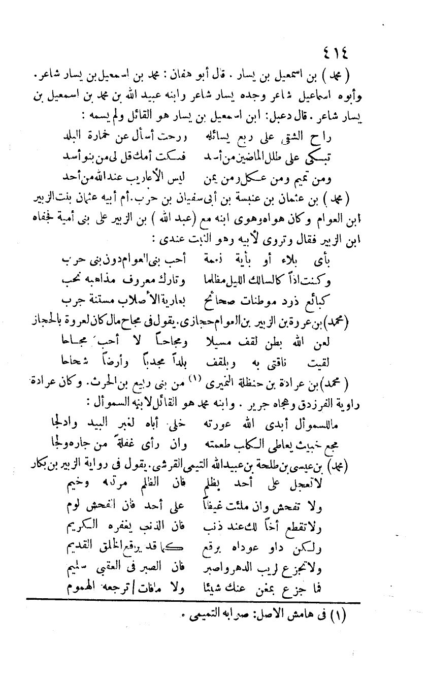 محمد بن إسماعيل بن يسار. قال أبو هفان: محمد بن إسماعيل بن يسار شاعر. وأبوه إسماعيل شاعر وجده يسار شاعر وابنه عبيد الله بن محمد ابن إسماعيل بن يسار شاعر. قال دعبل: ابن اسماعيل بن يسار هو القائل ولم يسمه: