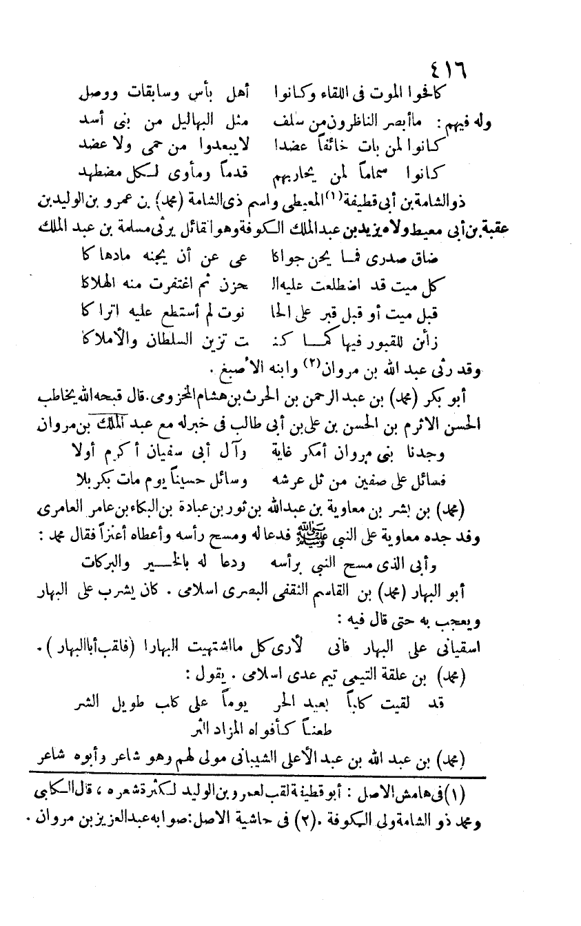 ذو الشامة بن أبي قطيفة المعيطي واسم ذي الشامة محمد بن عمرو ابن الوليد بن عقبة بن أبي معيط. ولاه عبد الملك الكوفة وهو القائل يرثي مسلمة بن عبد الملك: