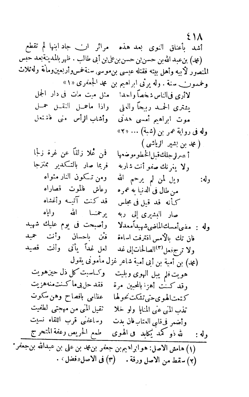 محمد بن عبد الله بن حسن بن حسن بن علي بن أبي طالب. ظهر بالمدينة بعد حبس المنصور لأبيه وأهل بيته فقتله عيسى بن موسى سنة خمس وأربعين ومائة وله ثلاث وخمسون سنة. وله يرثي إبراهيم بن محمد الجعفري: