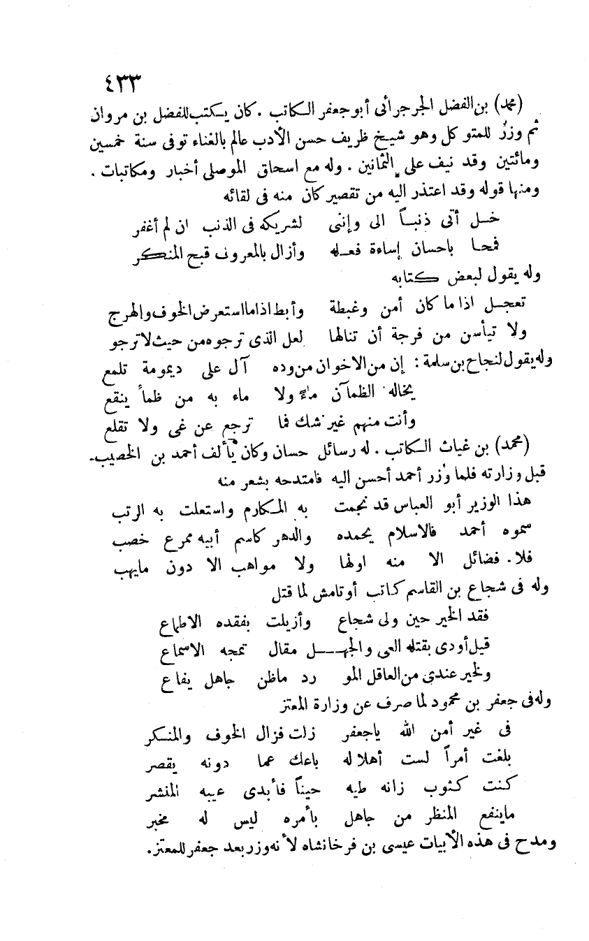 محمد بن الفضل الجرجرائي أبو جعفر الكاتب. كان يكتب للفضل ابن مروان ثم وزر للمتوكل وهو شيخ ظريف حسن الأدب عالم بالغناء توفي سنة خمسين ومائتين وقد نيف على الثمانين. وله مع إسحاق الموصلي أخبار ومكاتبات. ومنها قوله وقد اعتذر إليه من تقصير كان منه في لقائه: