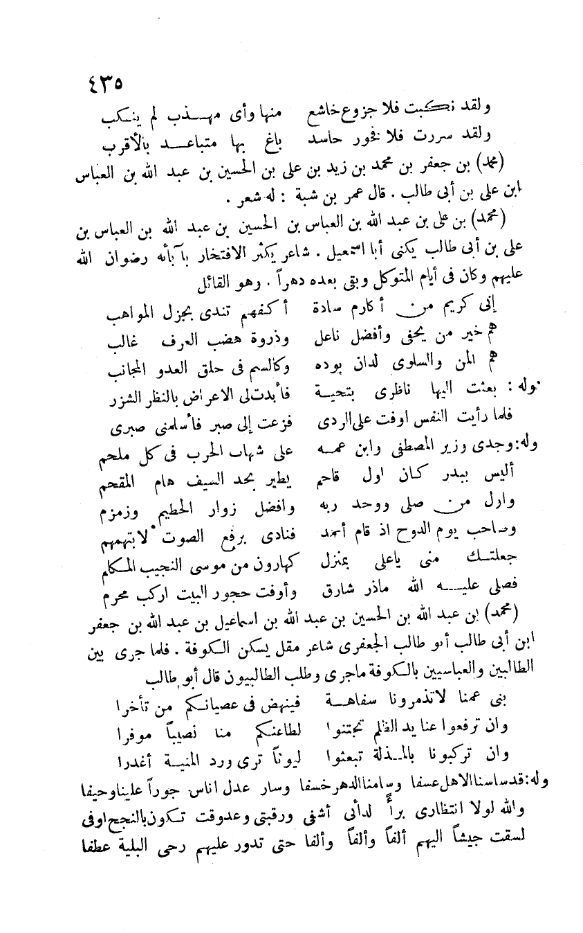 محمد بن علي بن عبد الله بن العباس بن الحسين بن عبد الله بن العباس بن علي بن أبي طالب يكنى أبا إسماعيل. شاعر يكثر الافتخار بآبائه رضوان الله عليهم وكان في أيام المتوكل وبقي بعده دهراً. وهو القائل: