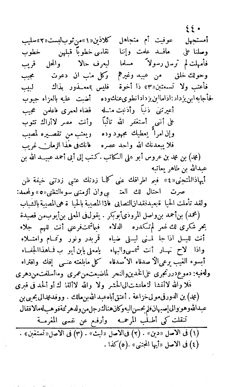 محمد بن محمد بن عروس أبو علي الكاتب. كتب إلى أبي أحمد عبيد الله بن عبد الله بن طاهر يعاتبه: