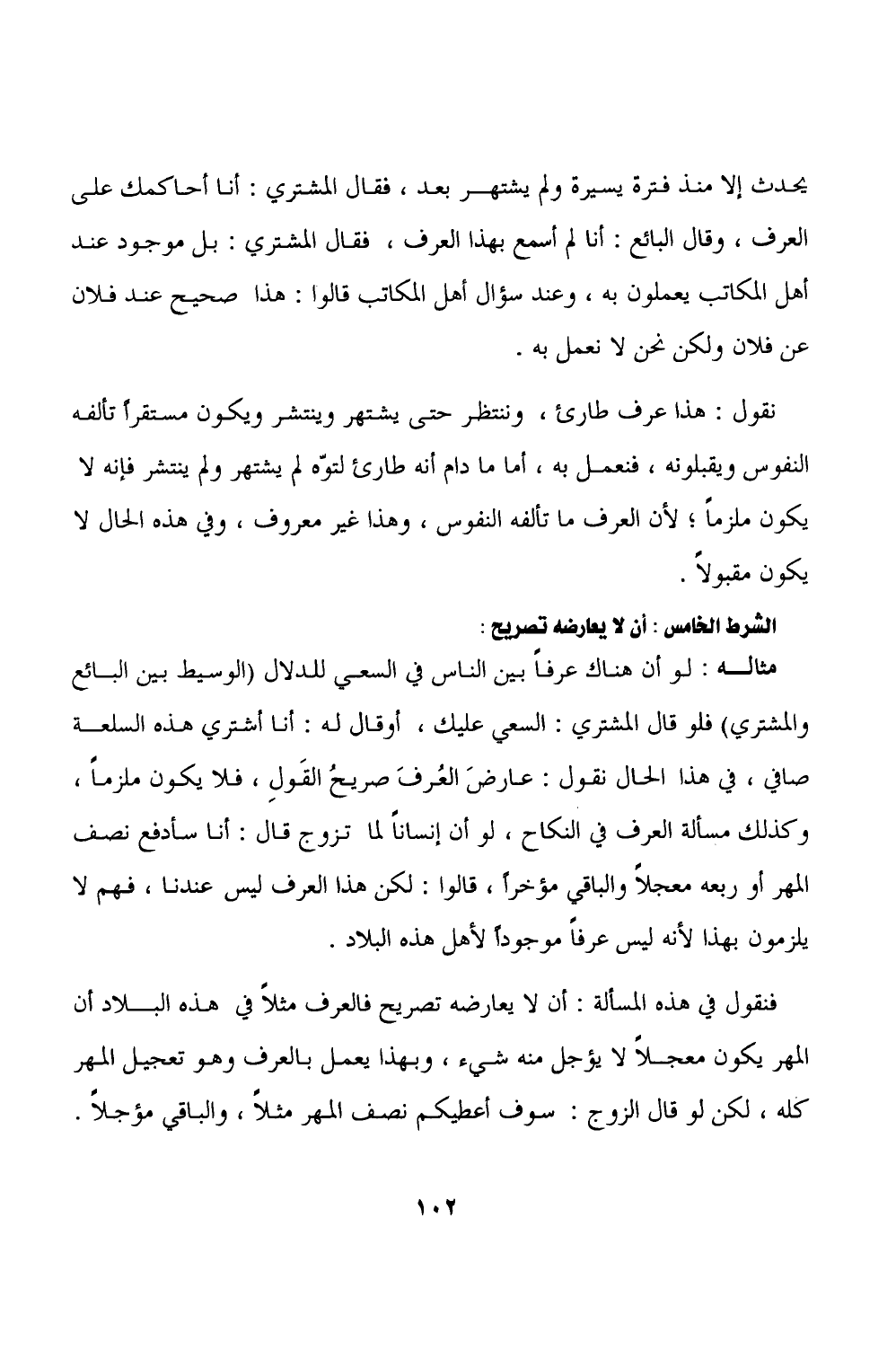 مثاله: لو أن هناك عرفًا بين الناس في السعي للدلال (الوسيط بين البائع والمشتري) فلو قال المشتري: السعي عليك، أو قال له: أنا أشتري هذه السلعة صافي، في هذا الحال نقول: عارضَ العُرفَ صريحُ القَولِ، فلا يكون ملزمًا، وكذلك مسألة العرف في النكاح، لو أن إنسانًا لما تزوج قال: أنا سأدفع نصف المهر أو ربعه معجلًا والباقى مؤخراً، قالوا: لكن هذا العرف ليس عندنا، فهم لا يلزمون بهذا لأنه ليس عرفًا موجوداً لأهل هذه البلاد.