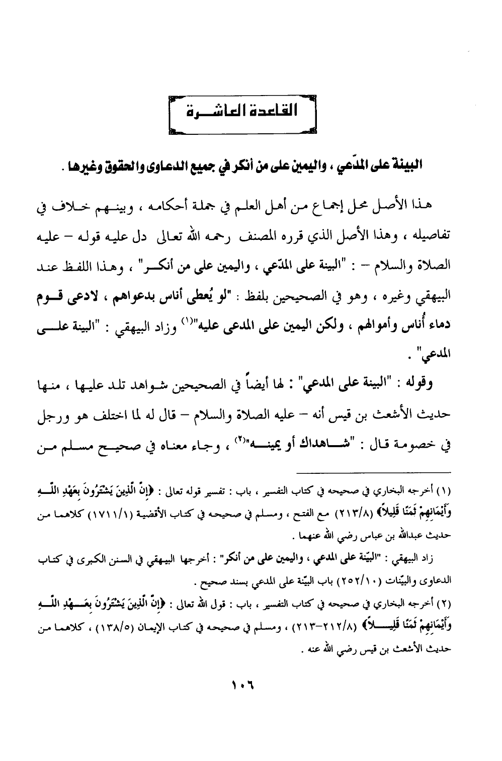 القاعدة العاشرة البينة على المدّعي، واليمين على من أنكر في جميع الدعاوي والحقوق وغيرها