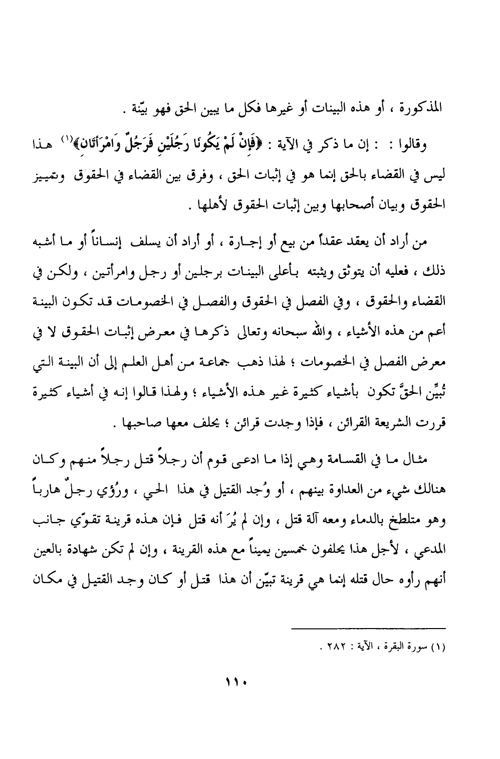 من أراد أن يعقد عقداً من بيع أو إجارة، أو أراد أن يسلف إنسانًا أو ما أشبه ذلك، فعليه أن يتوثق ويثبته بأعلى البينات برجلين أو رجل وامرأتين، ولكن في القضاء والحقوق، وفي الفصل في الحقوق والفصل في الخصومات قد تكون البينة أعم من هذه الأشياء، والله سبحانه وتعالى ذكرها في معرض إثبات الحقوق لا في معرض الفصل في الخصومات؛ لهذا ذهب جماعة من أهل العلم إلى أن البينة التي تُبيِّن الحقَّ تكون بأشياء كثيرة غير هذه الأشياء؛ ولهذا قالوا إنه في أشياء كثيرة قررت الشريعة القرائن، فإذا وجدت قرائن؛ يحلف معها صاحبها.