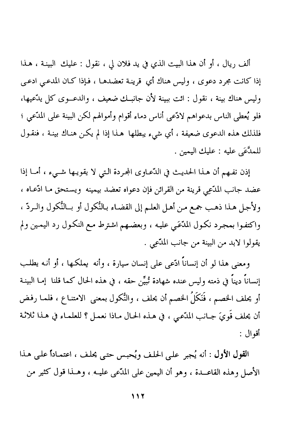 ألف ريال، أو أن هذا البيت الذي في يد فلان لي، نقول: عليك البينة، هذا إذا كانت مجرد دعوى، وليس هناك أي قرينة تعضدها، فإذا كان المدعي ادعى وليس هناك بينة، نقول: ائت ببينة لأن جانبك ضعيف، والدعوى كل يدّعيها، فلو يُعطى الناس بدعواهم لادّعى أناس دماء أقوام وأموالهم لكن البينة على المدّعي، فلذلك هذه الدعوى ضعيفة، أي شيء يبطلها هذا إذا لم يكن هناك بينة، فنقول للمدَّعَى عليه: عليك اليمين.
