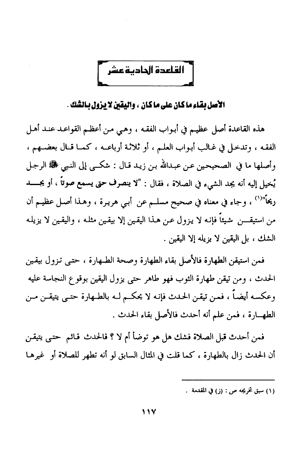 القاعدة الحادية عشر الأصل بقاء ما كان على ما كان، واليقين لا يزول بالشك