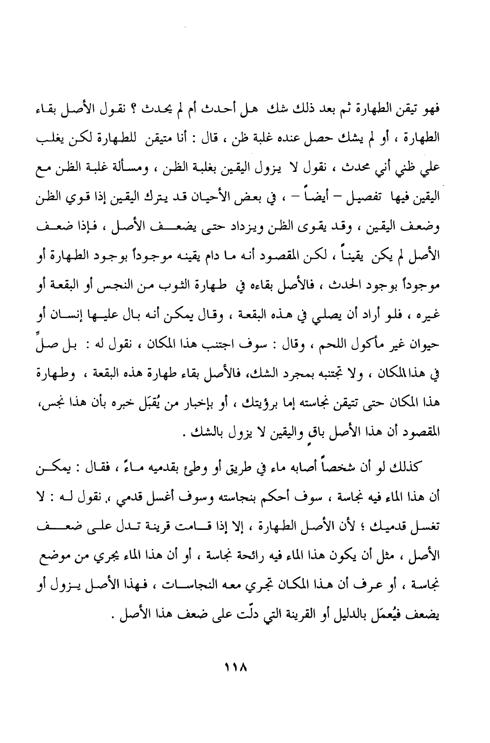 فهو تيقن الطهارة ثم بعد ذلك شك هل أحدث أم لم يحدث؟ نقول الأصل بقاء الطهارة، أو لم يشك حصل عنده غلبة ظن، قال: أنا متيقن للطهارة لكن يغلب علي ظنى أنى محدث، نقول لا يزول اليقين بغلبة الظن، ومسألة غلبة الظن مع اليقين فيها تفصيل - أيضاً -، في بعض الأحيان قد يترك اليقين إذا قوي الظن وضعف اليقين، وقد يقوى الظن ويزداد حتى يضعف الأصل، فإذا ضعف الأصل لم يكن يقيناً، لكن المقصود أنه ما دام يقينه موجوداً بوجود الطهارة أو موجوداً بوجود الحدث، فالأصل بقاءه في طهارة الثوب من النجس أو البقعة أو غيره، فلو أراد أن يصلي في هذه البقعة، وقال يمكن أنه بال عليها إنسان أو حيوان غير مأكول اللحم، وقال: سوف اجتنب هذا المكان، نقول له: بل صلِّ في هذا المكان، ولا تجتنبه بمجرد الشك، فالأصل بقاء طهارة هذه البقعة، وطهارة هذا المكان حتى تتيقن نجاسته إما برؤيتك، أو بإخبار من يُقبَل خبره بأن هذا نجس، المقصود أن هذا الأصل باقٍ واليقين لا يزول بالشك.
