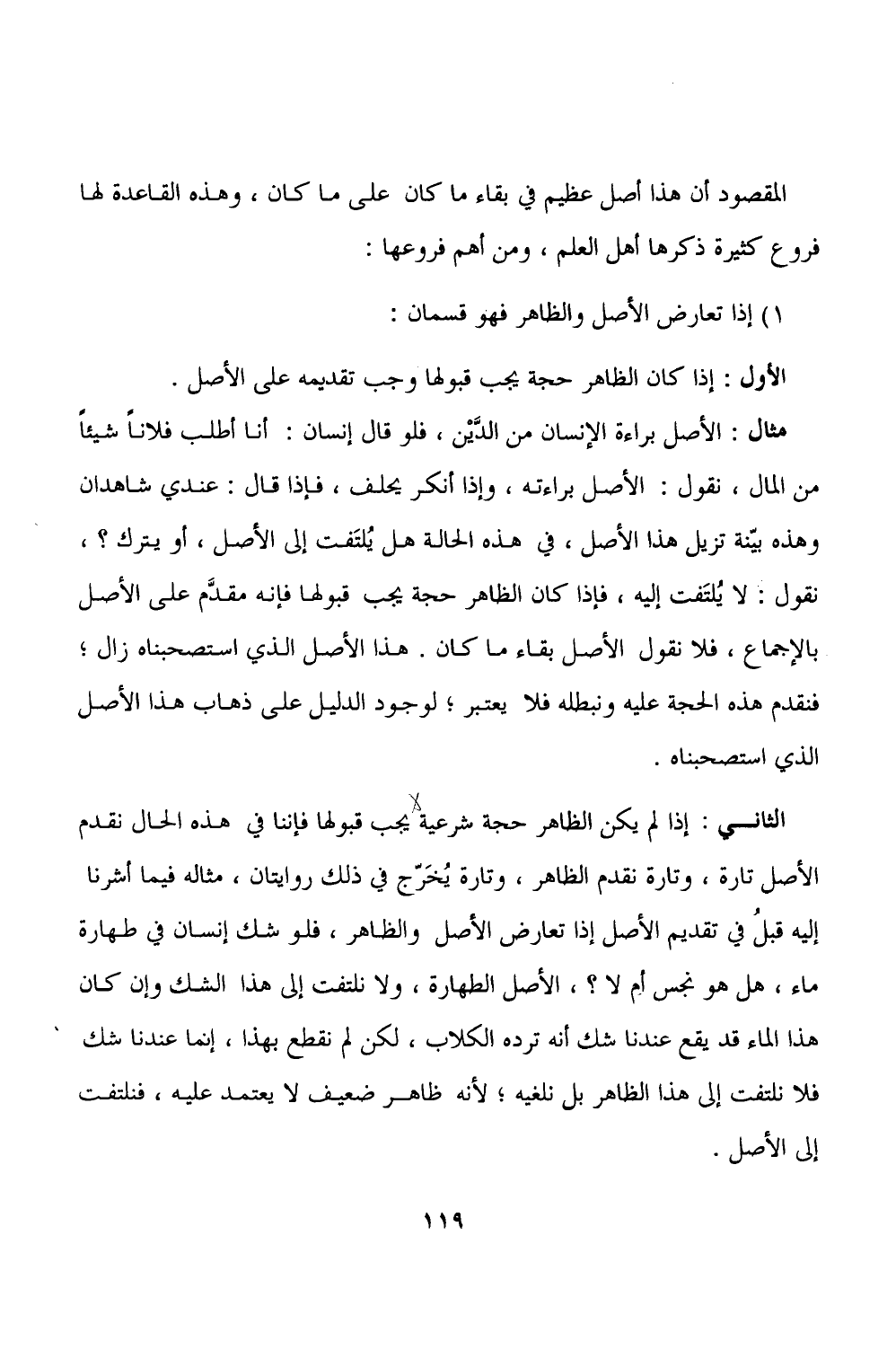 مثال: الأصل براءة الإنسان من الدَّيْن، فلو قال إنسان: أنا أطلب فلاناً شيئًا من المال، نقول: الأصل براءته، وإذا أنكر يحلف، فإذا قال: عندي شاهدان وهذه بيّنة تزيل هذا الأصل، في هذه الحالة هل يُلتَفت إلى الأصل، أو يترك؟، نقول: لا يُلتَفت إليه، فإذا كان الظاهر حجة يجب قبولها فإنه مقدَّم على الأصل بالإجماع، فلا نقول الأصل بقاء ما كان. هذا الأصل الذي استصحبناه زال؛ فنقدم هذه الحجة عليه ونبطله فلا يعتبر؛ لوجود الدليل على ذهاب هذا الأصل الذى استصحبناه.