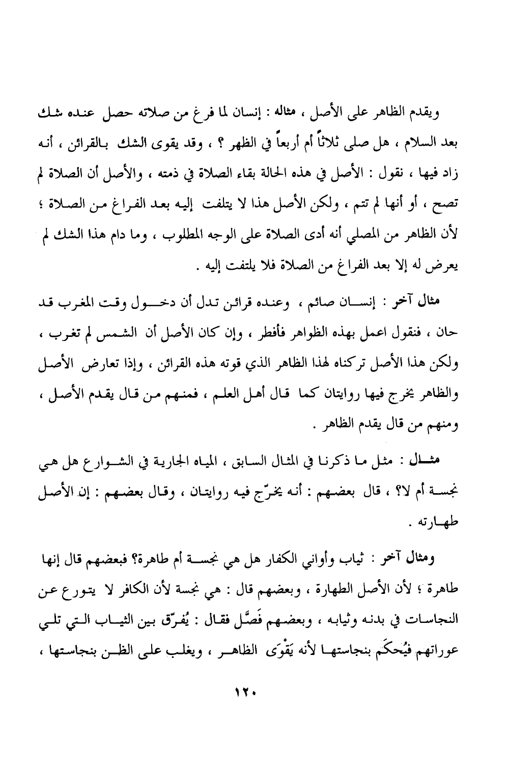 ومثال آخر: ثياب وأواني الكفار هل هي نجسة أم طاهرة؟ فبعضهم قال إنها طاهرة؛ لأن الأصل الطهارة، وبعضهم قال: هى نجسة لأن الكافر لا يتورع عن النجاسات في بدنه وثيابه، وبعضهم فَصَّل فقال: يُفرّق بين الثياب التى تلى عوراتهم فيُحكَم بنجاستها لأنه يَقْوَى الظاهر، ويغلب على الظن بنجاستها،