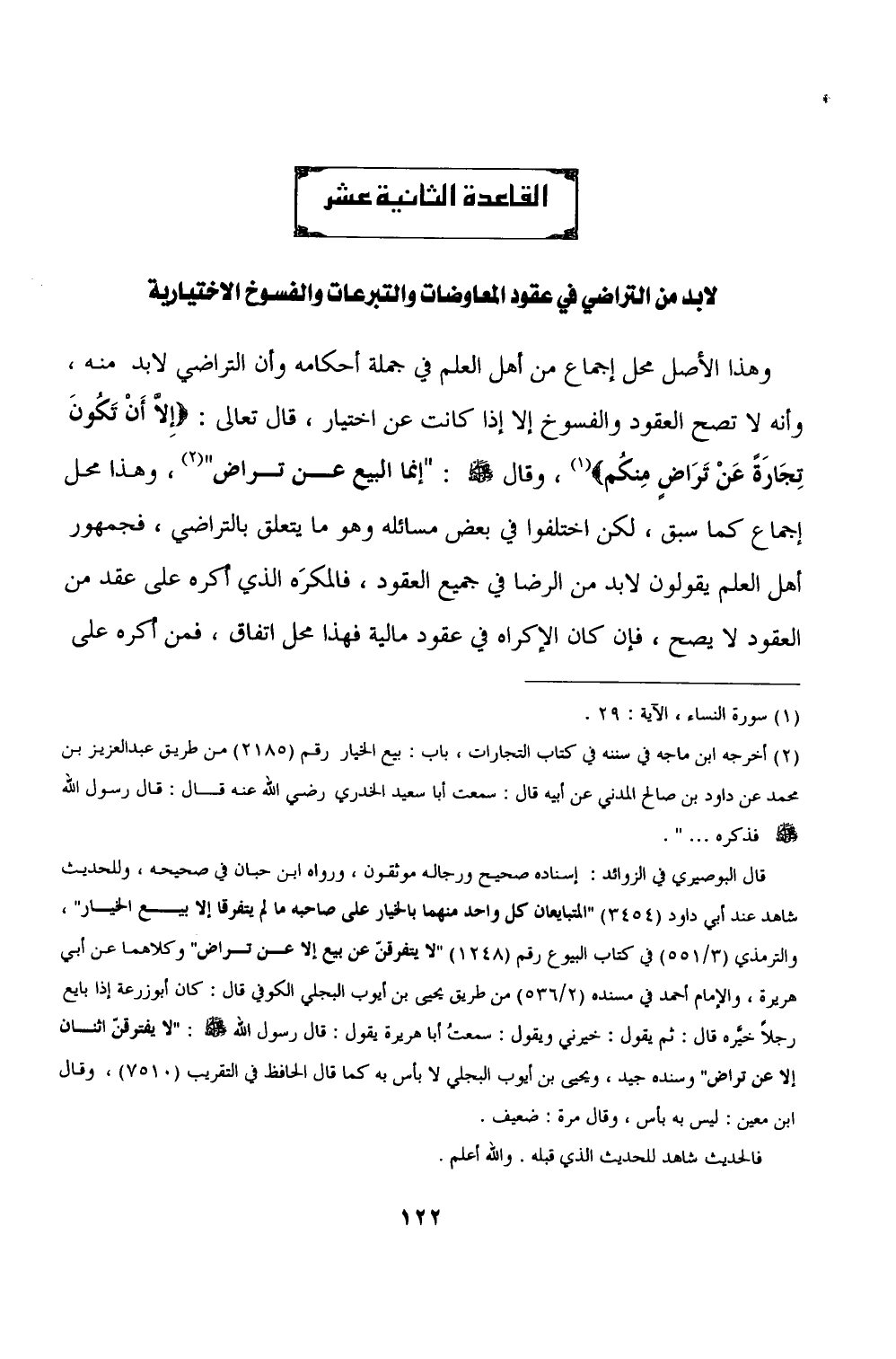 القاعدة الثانية عشر لابد من التراضي في عقود المعاوضات والتبرعات والفسوخ الاختيارية