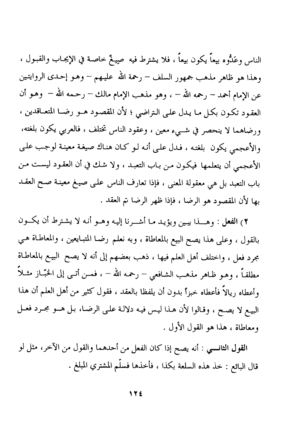 الناس وعَدُّوه بيعاً يكون بيعاً، فلا يشترط فيه صِيغٌ خاصة في الإيجاب والقبول، وهذا هو ظاهر مذهب جمهور السلف - رحمة الله عليهم - وهو إحدى الروايتين عن الإمام أحمد - رحمه الله -، وهو مذهب الإمام مالك - رحمه الله - وهو أن العقود تكون بكل ما يدل على التراضى، لأن المقصود هو رضا المتعاقدين، ورضاهما لا ينحصر في شيء معين، وعقود الناس تختلف، فالعربي يكون بلغته، والأعجمى يكون بلغته، فدل على أنه لو كان هناك صيغة معينة لوجب على الأعجمي أن يتعلمها فيكون من باب التعبد، ولا شك في أن العقود ليست من باب التعبد بل هي معقولة المعنى، فإذا تعارف الناس على صيغ معينة صح العقد بها لأن المقصود هو الرضا، فإذا ظهر الرضا تم العقد.