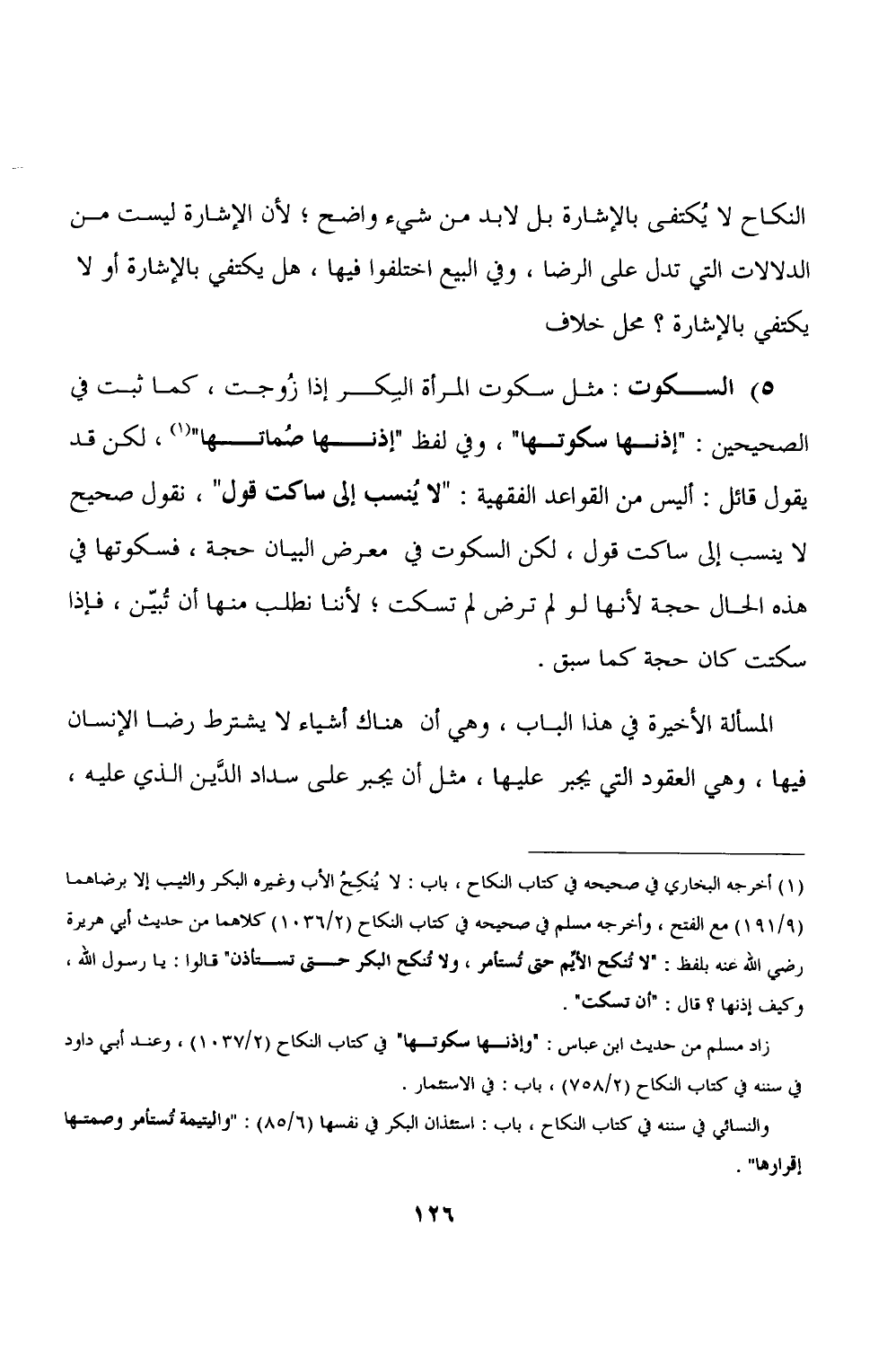 ٥) السكوت: مثل سكوت المرأة البِكر إذا زُوجت، كما ثبت في الصحيحين: "إذنها سكوتها"، وفي لفظ "إذنها صُماتها" (١)، لكن قد يقول قائل: أليس من القواعد الفقهية: "لا يُنسب إلى ساكت قول"، نقول صحيح لا ينسب إلى ساكت قول، لكن السكوت في معرض البيان حجة، فسكوتها في هذه الحال حجة لأنها لو لم ترض لم تسكت، لأننا نطلب منها أن تُبيّن، فإذا سكتت كان حجة كما سبق.