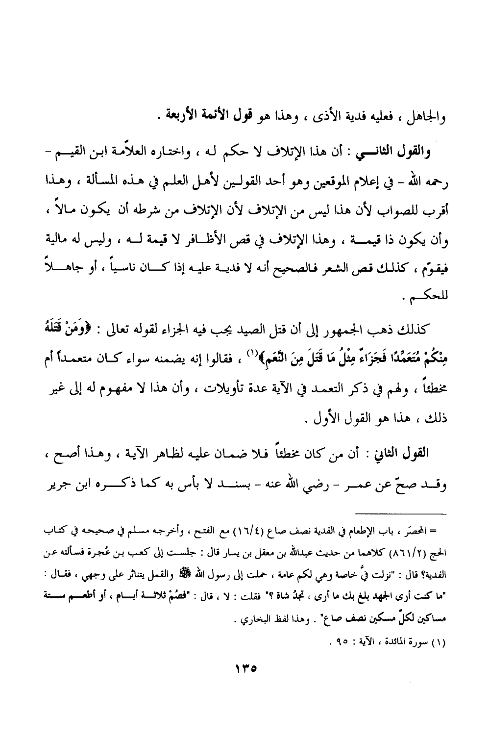 والقول الثاني: أن هذا الإتلاف لا حكم له، واختاره العلامة ابن القيم - رحمه الله - في إعلام الموقعين وهو أحد القولين لأهل العلم في هذه المسألة، وهذا أقرب للصواب لأن هذا ليس من الإتلاف لأن الإتلاف من شرطه أن يكون مالاً، وأن يكون ذا قيمة، وهذا الإتلاف في قص الأظافر لا قيمة له، وليس له مالية فيقوّم، كذلك قص الشعر فالصحيح أنه لا فدية عليه إذا كان ناسياً، أو جاهلاً للحكم.