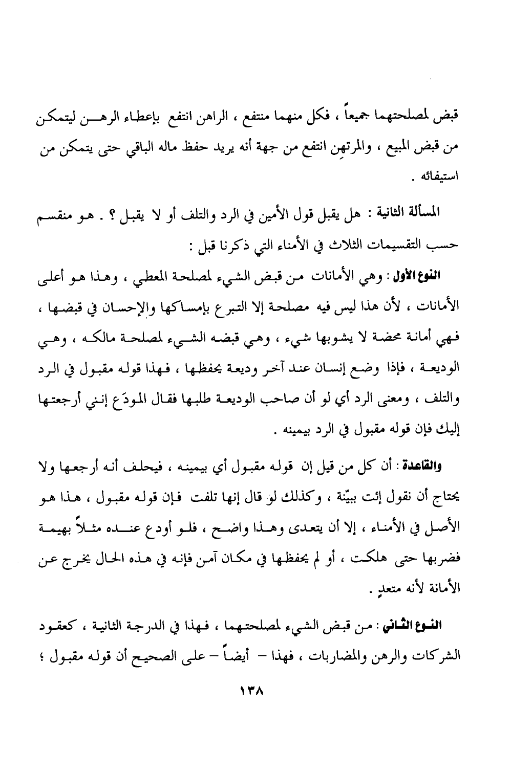 النوع الأول: وهى الأمانات من قبض الشيء لمصلحة المعطي، وهذا هو أعلى الأمانات، لأن هذا ليس فيه مصلحة إلا التبرع بإمساكها والإحسان في قبضها، فهى أمانة محضة لا يشوبها شيء، وهى قبضه الشيء لمصلحة مالكه، وهي الوديعة، فإذا وضع إنسان عند آخر وديعة يحفظها، فهذا قوله مقبول في الرد والتلف، ومعنى الرد أي لو أن صاحب الوديعة طلبها فقال المودَع إننى أرجعتها إليك فإن قوله مقبول في الرد بيمينه.