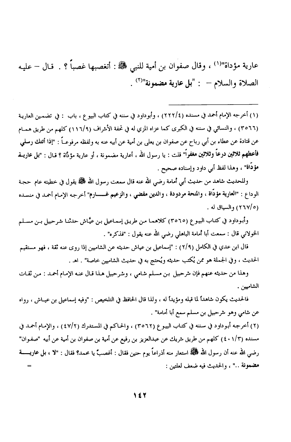 (٢) أخرجه أبو داود فى سننه في كتاب البيوع (٣٥٦٢)، والحاكم في المستدرك (٢/ ٤٧)، والإمام أحمد في مسنده (٣/ ٤٠١) كلهم من طريق شريك عن عبد العزيز بن رفيع عن أمية بن صفوان بن أمية عن أبيه "صفوان" رضى الله عنه أن رسول الله - صلى الله عليه وسلم - استعار منه أذراعاً يوم حنين فقال: أغصبٌ يا محمد؟ فقال: "لا، بل عارية مضمونة. . "، والحديث فيه ضعف لعلتين:=