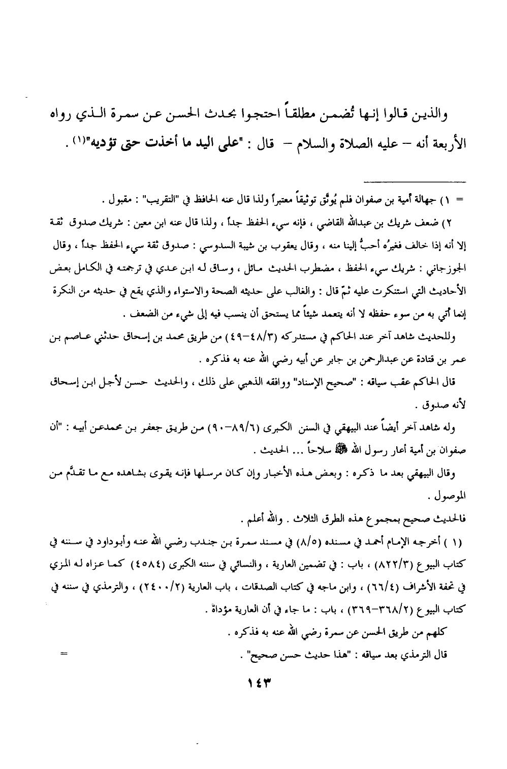 (١) أخرجه الإمام أحمد في مسنده (٥/ ٨) في مسند سمرة بن جندب رضى الله عنه وأبو داود في سننه في كتاب البيوع (٣/ ٨٢٢)، باب: في تضمين العارية، والنسائى في سننه الكبرى (٤٥٨٤) كما عزاه له المزي في تحفة الأشراف (٤/ ٦٦)، وابن ماجه في كتاب الصدقات، باب العارية (٢/ ٢٤٠٠)، والترمذى في سننه في كتاب البيوع (٢/ ٣٦٨ - ٣٦٩)، باب: ما جاء في أن العارية مؤداة.