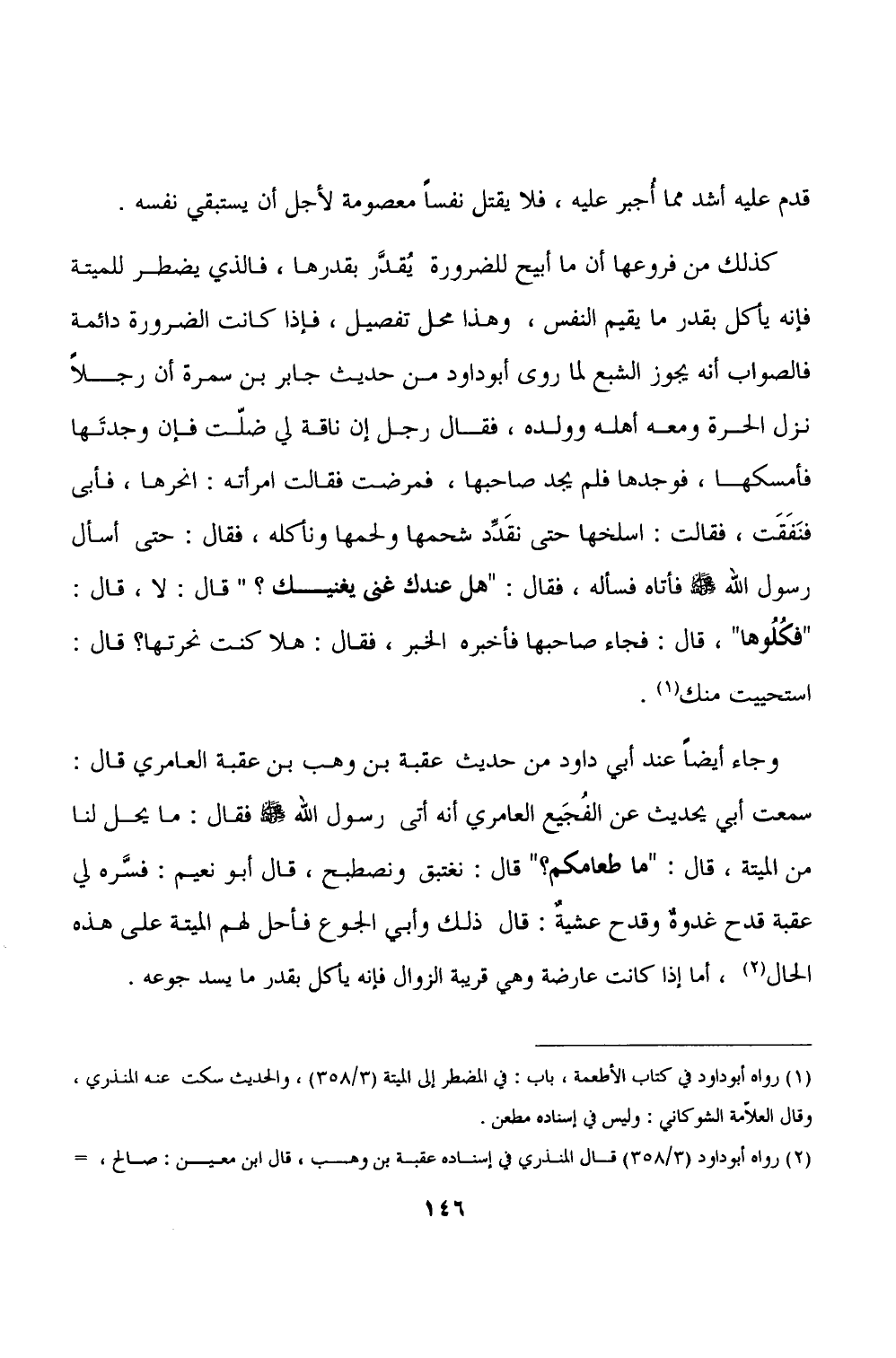 (١) رواه أبو داود في كتاب الأطعمة، باب: في المضطر إلى الميتة (٣/ ٣٥٨)، والحديث سكت عنه المنذرى، وقال العلامة الشوكانى: وليس في إسناده مطعن.