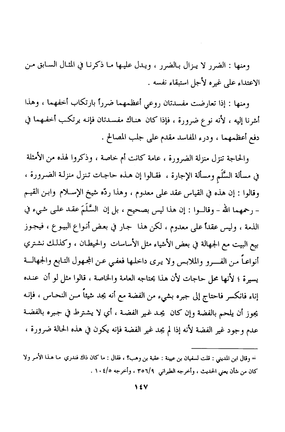 والحاجة تنزل منزلة الضرورة، عامة كانت أم خاصة، وذكروا لهذه من الأمثلة في مسألة السَّلَمِ ومسألة الإجارة، فقالوا إن هذه حاجات تنزل منزلة الضرورة، وقالوا: إن هذه في القياس عقد على معدوم، وهذا ردّه شيخ الإسلام وابن القيم - رحمهما الله - وقالوا: إن هذا ليس بصحيح، بل إن السَّلَمَ عقد على شيء في الذمة، وليس عقدًا على معدوم، لكن هذا جار في بعض أنواع البيوع، فيجوز بيع البيت مع الجهالة في بعض الأشياء مثل الأساسات والحيطان، وكذلك نشتري أنواعًا من الفرو والملابس ولا يرى داخلها فعفي عن المجهول التابع والجهالة يسيرة؛ لأنها محل حاجات لأن هذا يحتاجه العامة والخاصة، قالوا مثل لو أن عنده إناء فانكسر فاحتاج إلى جبره بشيء من الفضة مع أنه يجد شيئاً من النحاس، فإنه يجوز أن يلحم بالفضة وإن كان يجد غير الفضة، أي لا يشترط في جبره بالفضة عدم وجود غير الفضة لأنه إذا لم يجد غير الفضة فإنه يكون في هذه الحالة ضرورة،