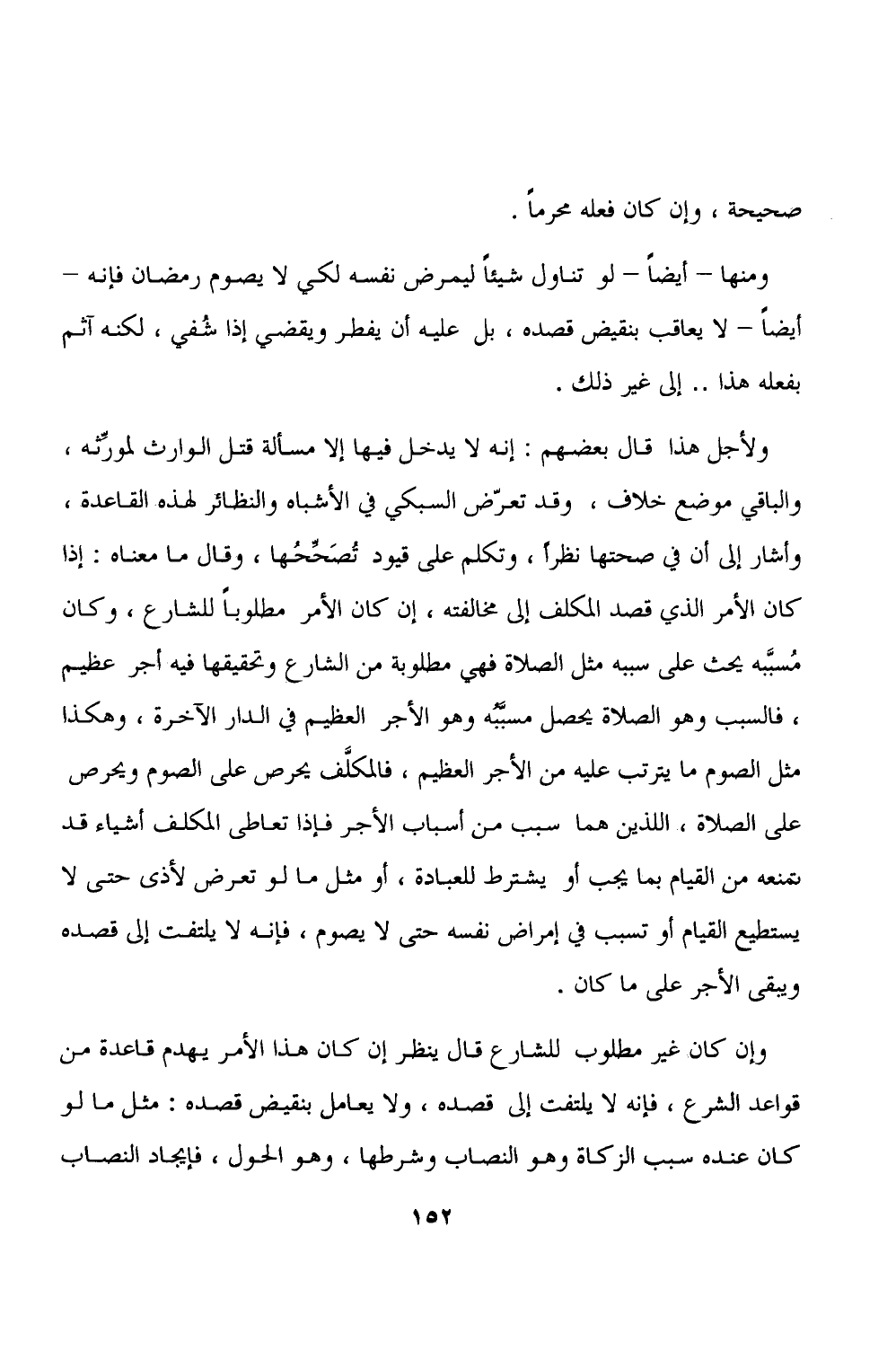 ولأجل هذا قال بعضهم: إنه لا يدخل فيها إلا مسألة قتل الوارث لمورثه، والباقي موضع خلاف، وقد تعرّض السبكى في الأشباه والنظائر لهذه القاعدة، وأشار إلى أن في صحتها نظراً، وتكلم على قيود تُصَحّحُها، وقال ما معناه: إذا كان الأمر الذي قصد المكلف إلى مخالفته، إن كان الأمر مطلوباً للشارع، وكان مُسبَّبه يحث على سببه مثل الصلاة فهى مطلوبة من الشارع وتحقيقها فيه أجر عظيم، فالسبب وهو الصلاة يحصل مسببُه وهو الأجر العظيم في الدار الآخرة، وهكذا مثل الصوم ما يترتب عليه من الأجر العظيم، فالمكلَّف يحرص على الصوم ويحرص على الصلاة، اللذين هما سبب من أسباب الأجر فإذا تعاطى المكلف أشياء قد تمنعه من القيام بما يجب أو يشترط للعبادة، أو مثل ما لو تعرض لأذى حتى لا يستطع القيام أو تسبب في إمراض نفسه حتى لا يصوم، فإنه لا يلتفت إلى قصده ويبقى الأجر على ما كان.