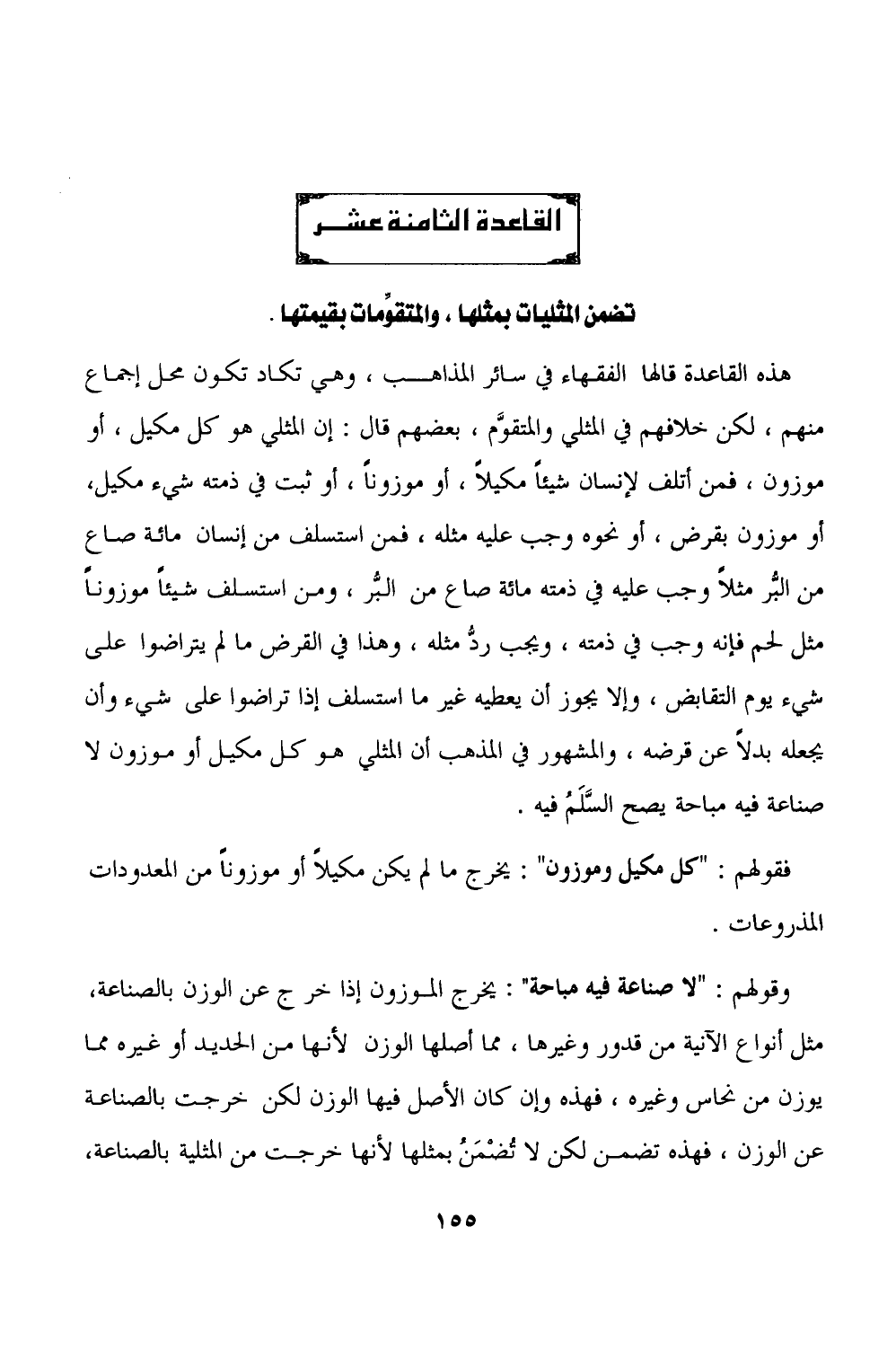 هذه القاعدة قالها الفقهاء في سائر المذاهب، وهي تكاد تكون محل إجماع منهم، لكن خلافهم في المثلى والمتقوَّم، بعضهم قال: إن المثلى هو كل مكيل، أو موزون، فمن أتلف لإنسان شيئاً مكيلًا، أو موزوناً، أو ثبت في ذمته شيء مكيل، أو موزون بقرض، أو نحوه وجب عليه مثله، فمن استسلف من إنسان مائة صاع من البرّ مثلاً وجب عليه في ذمته مائة صاع من البرّ، ومن استسلف شيئاً موزوناً مثل لحم فإنه وجب في ذمته، ويجب ردُّ مثله، وهذا في القرض ما لم يتراضوا على شيء يوم التقابض، وإلا يجوز أن يعطيه غير ما استسلف إذا تراضوا على شيء وأن يجعله بدلاً عن قرضه، والمشهور في المذهب أن المثلي هو كل مكيل أو موزون لا صناعة فيه مباحة يصح السَّلَمُ فيه.