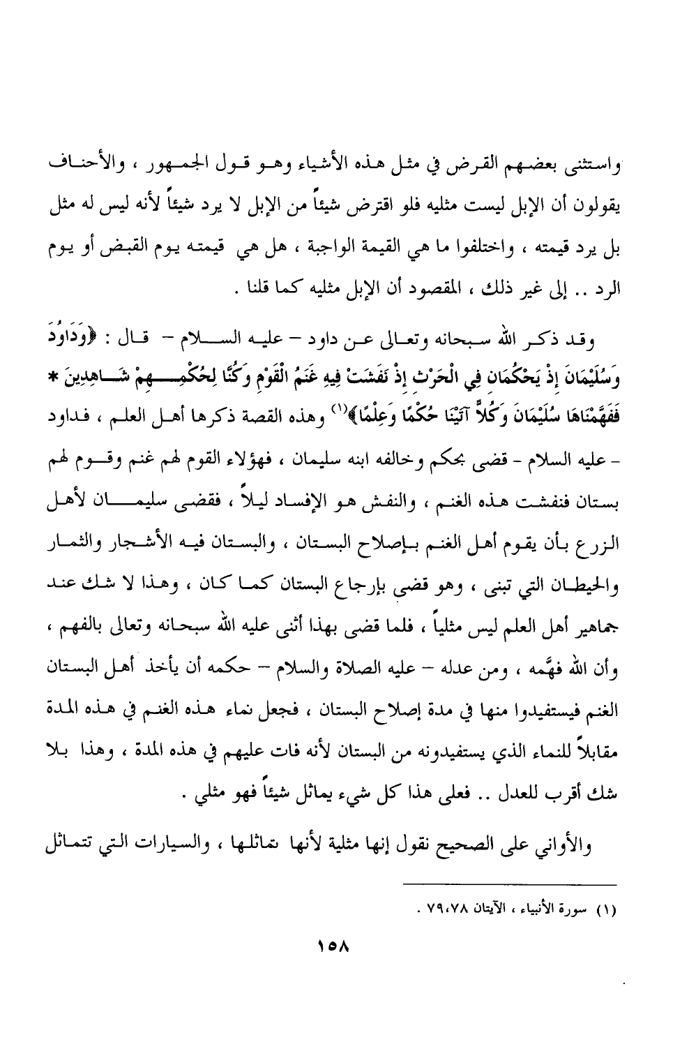 وقد ذكر الله سبحانه وتعالى عن داود - عليه السلام - قال: {وَدَاوُودَ وَسُلَيْمَانَ إِذْ يَحْكُمَانِ فِي الْحَرْثِ إِذْ نَفَشَتْ فِيهِ غَنَمُ الْقَوْمِ وَكُنَّا لِحُكْمِهِمْ شَاهِدِينَ * فَفَهَّمْنَاهَا سُلَيْمَانَ وَكُلًّا آتَيْنَا حُكْمًا وَعِلْمًا} (١) وهذه القصة ذكرها أهل العلم، فداود - عليه السلام - قضى بحكم وخالفه ابنه سليمان، فهؤلاء القوم لهم غنم وقوم لهم بستان فنفشت هذه الغنم، والنفش هو الإفساد ليلًا، فقضى سليمان لأهل الزرع بأن يقوم أهل الغنم بإصلاح البستان، والبستان فيه الأشجار والثمار والحيطان التى تبنى، وهو قضي بإرجاع البستان كما كان، وهذا لا شك عند جماهير أهل العلم ليس مثليًا، فلما قضى بهذا أثنى عليه الله سبحانه وتعالى بالفهم، وأن الله فهَّمه، ومن عدله - عليه الصلاة والسلام - حكمه أن يأخذ أهل البستان الغنم فيستفيدوا منها في مدة إصلاح البستان، فجعل نماء هذه الغنم في هذه المدة مقابلًا للنماء الذي يستفيدونه من البستان لأنه فات عليهم في هذه المدة، وهذا بلا شك أقرب للعدل. . فعلى هذا كل شيء يماثل شيئًا فهو مثلي.