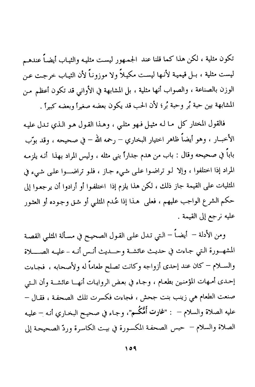 تكون مثلية، لكن هذا كما قلنا عند الجمهور ليست مثليه والثياب أيضًا عندهم ليست مثلية، بل قيمية لأنها ليست مكيلًا ولا موزونًا لأن الثياب خرجت عن الوزن بالصناعة، والصواب أنها مثلية، بل المشابهة في الأوانى قد تكون أعظم من المشابهة بين حبة بُر وحبة بُر، لأن الحب قد يكون بعضه صغيراً وبعضه كبيراً.