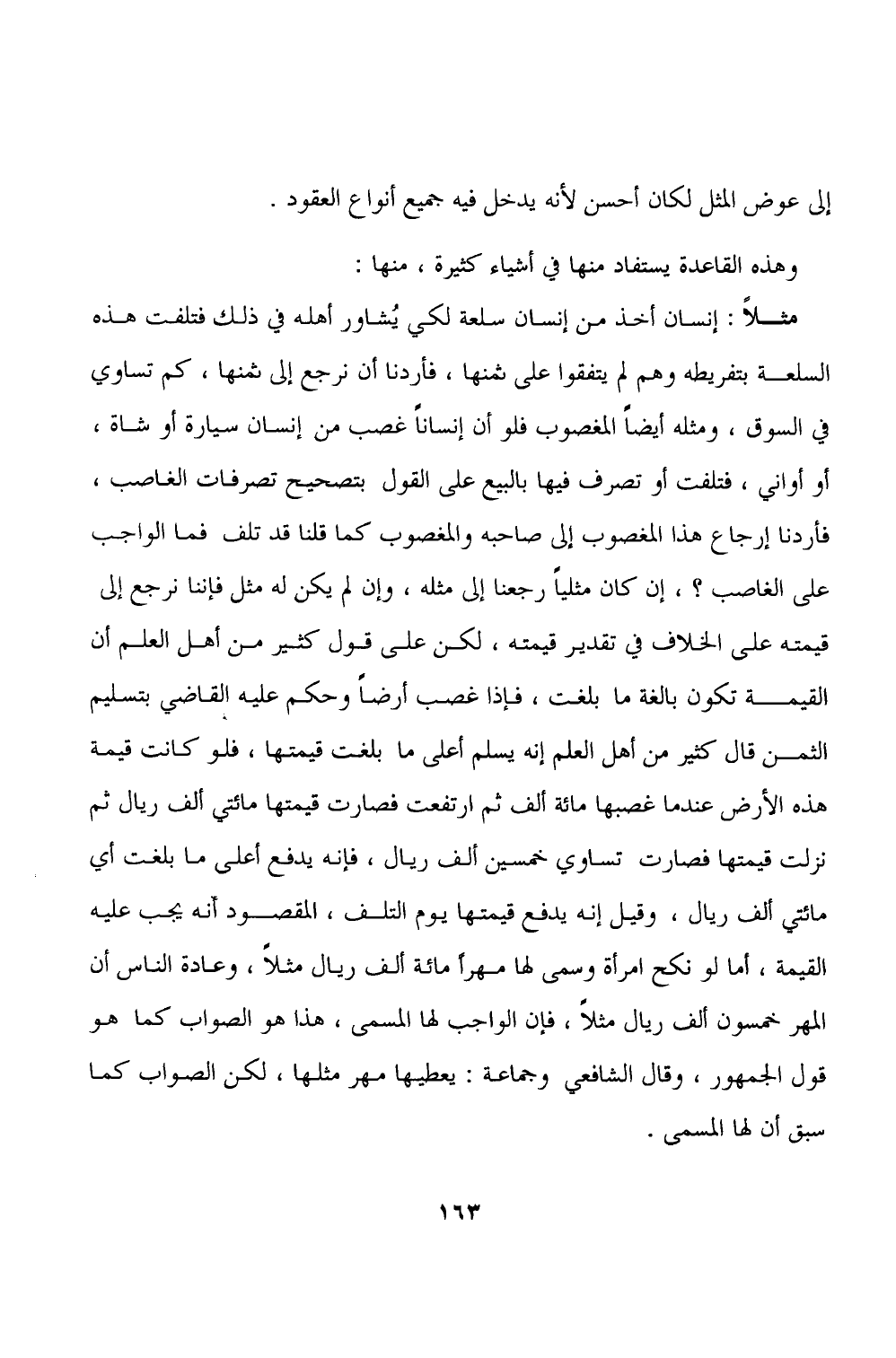 مثلاً: إنسان أخذ من إنسان سلعة لكي يشاور أهله في ذلك فتلفت هذه السلعة بتفريطه وهم لم يتفقوا على ثمنها، فأردنا أن نرجع إلى ثمنها، كم تساوي في السوق، ومثله أيضًا المغصوب فلو أن إنسانًا غصب من إنسان سيارة أو شاة، أو أواني، فتلفت أو تصرف فيها بالبيع على القول بتصحيح تصرفات الغاصب، فأردنا إرجاع هذا المغصوب إلى صاحبه والمغصوب كما قلنا قد تلف فما الواجب على الغاصب؟، إن كان مثليًا رجعنا إلى مثله، وإن لم يكن له مثل فإننا نرجع إلى قيمته على الخلاف في تقدير قيمته، لكن على قول كثير من أهل العلم أن القيمة تكون بالغة ما بلغت، فإذا غصب أرضًا وحكم عليه القاضي بتسليم الثمن قال كثير من أهل العلم إنه يسلم أعلى ما بلغت قيمتها، فلو كانت قيمة هذه الأرض عندما غصبها مائة ألف ثم ارتفعت فصارت قيمتها مائتى ألف ريال ثم نزلت قيمتها فصارت تساوي خمسين ألف ريال، فإنه يدفع أعلى ما بلغت أي مائتى ألف ريال، وقيل إنه يدفع قيمتها يوم التلف، المقصود أنه يجب عليه القيمة، أما لو نكح امرأة وسمى لها مهراً مائة ألف ريال مثلًا، وعادة الناس أن المهر خمسون ألف ريال مثلًا، فإن الواجب لها المسمى، هذا هو الصواب كما هو قول الجمهور، وقال الشافعى وجماعة: يعطها مهر مثلها، لكن الصواب كما سبق أن لها المسمى.