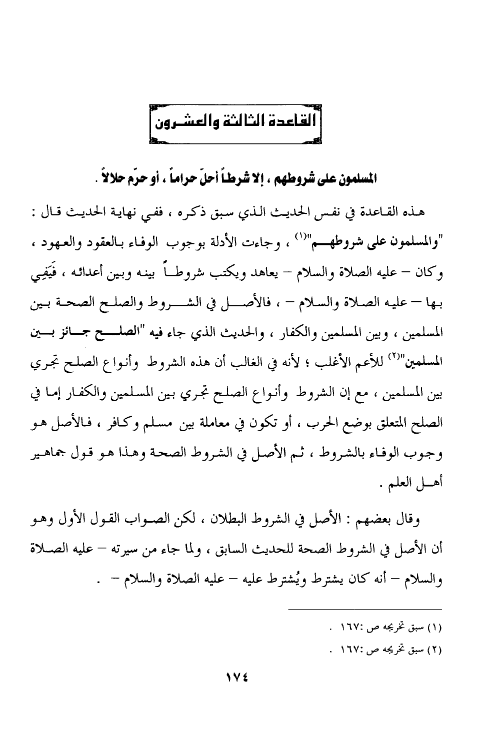القاعدة الثالثة والعشرون المسلمون على شروطهم، إلا شرطاً أحلّ حراماً، أو حرّم حلالاً