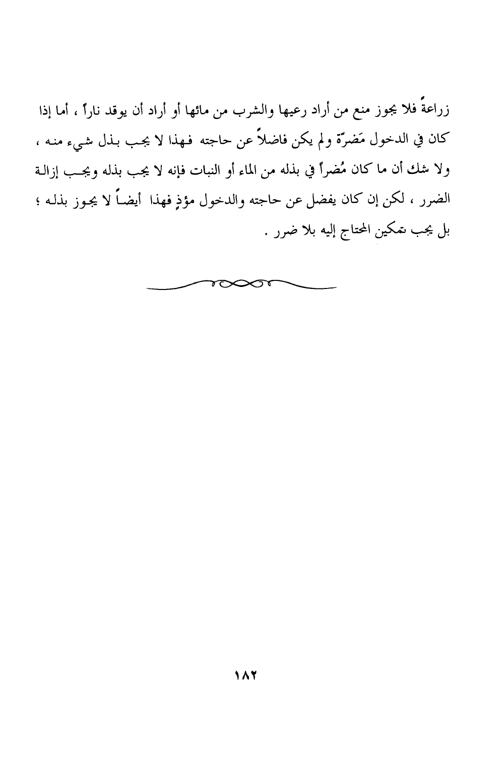 زراعةً فلا يجوز منع من أراد رعيها والشرب من مائها أو أراد أن يوقد ناراً، أما إذا كان في الدخول مَضرّة ولم يكن فاضلًا عن حاجته فهذا لا يجب بذل شيء منه، ولا شك أن ما كان مُضراً في بذله من الماء أو النبات فإنه لا يجب بذله ويجب إزالة الضرر، لكن إن كان يفضل عن حاجته والدخول مؤذٍ فهذا أيضًا لا يجوز بذله؛ بل يجب تمكين المحتاج إليه بلا ضرر.